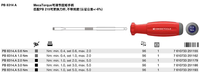 PB SWISS TOOLS 预设扭矩螺丝刀, 5.0Nm, PB 8314.A 5.0 Nm |