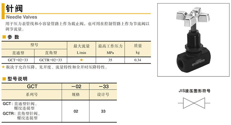 艾逊订货号:B1074833 原始型号:榆次油研 直通式针阀,GCT-02-31 品牌:Yuci/榆次 品牌所属地:中国