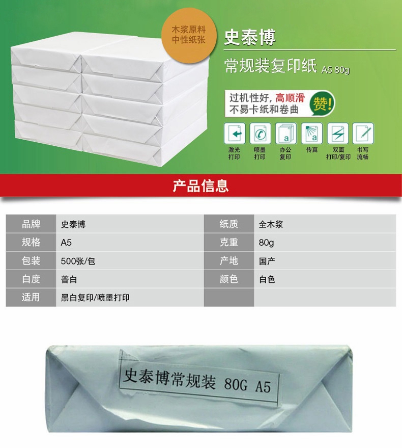 史泰博80G精品装复印纸,5包/箱 A4 白色 单位:包 |