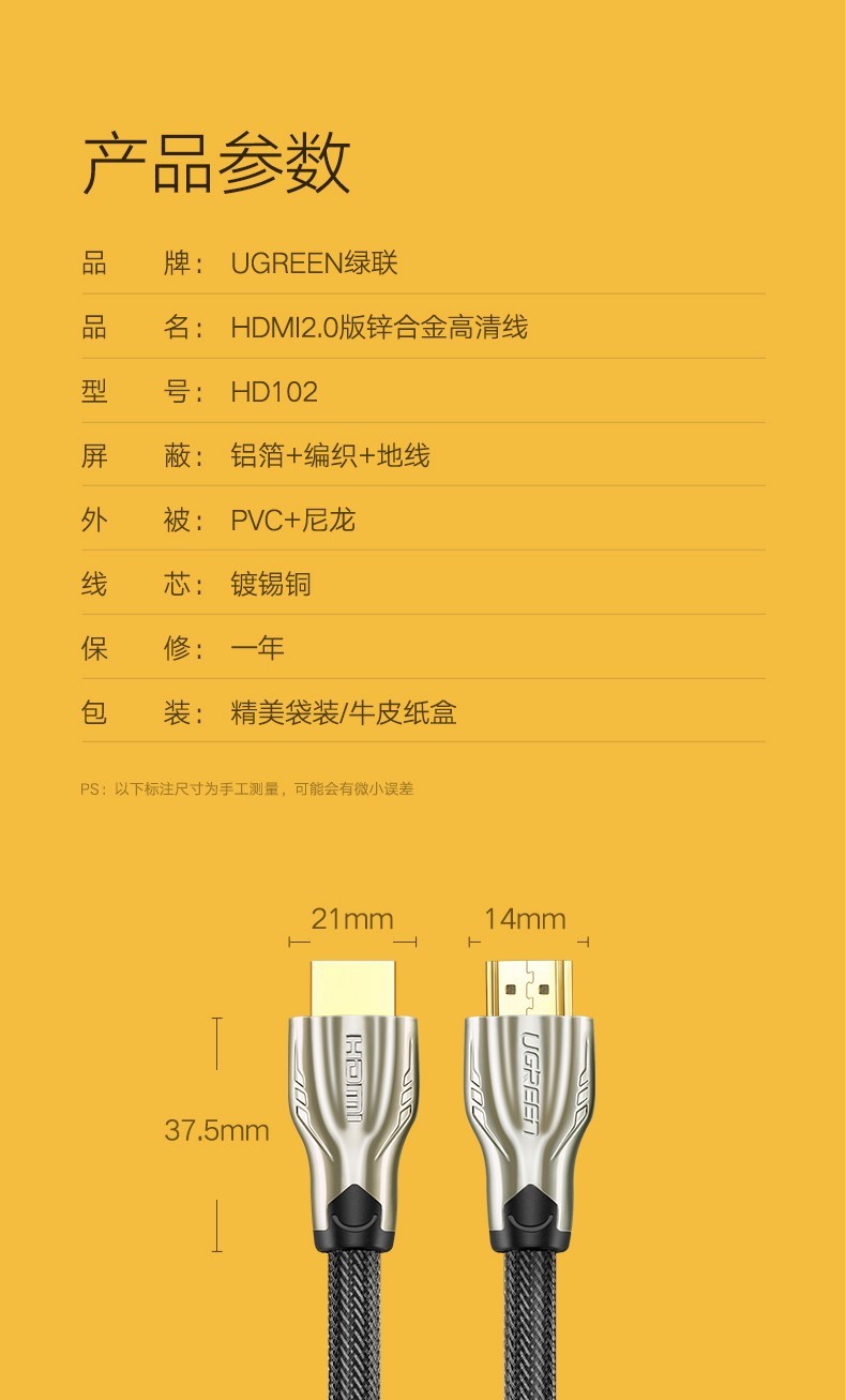 绿联 新版HDMI线连接线, 豪华金属接头 圆线 高密度尼龙编网防磨损 1.4版5米 单位:条 |