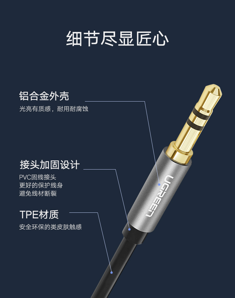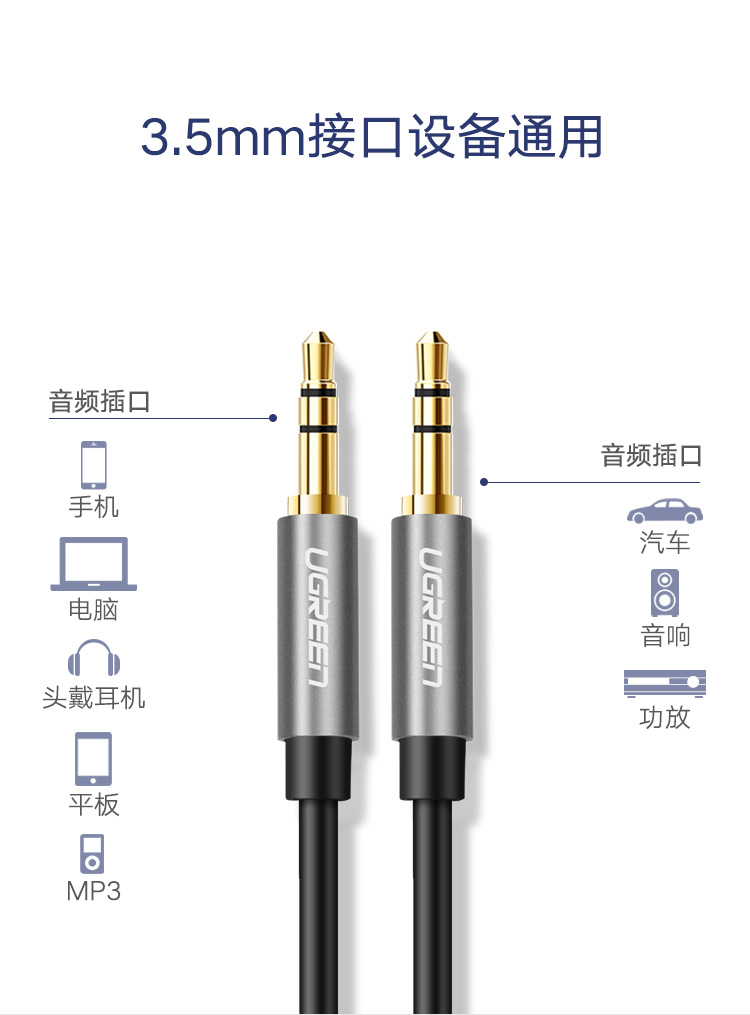 UGREEN/绿联的电脑清洁绿联AUX车载音频线,手机、MP3/4接音箱音频线圆线黑色直头对直头镀金1.5米单位:条
