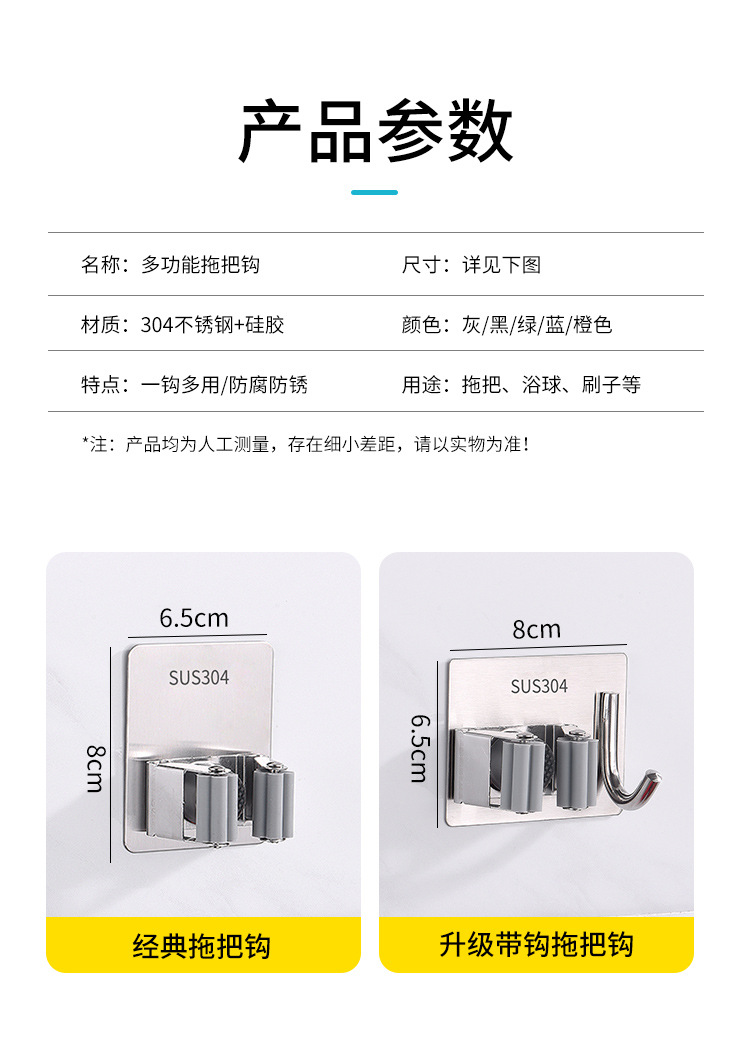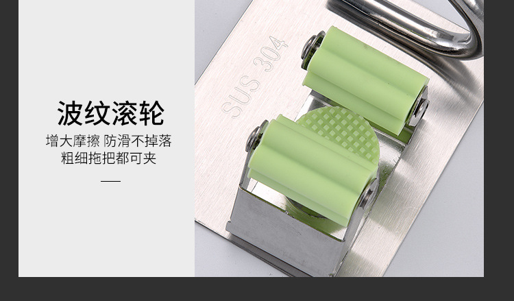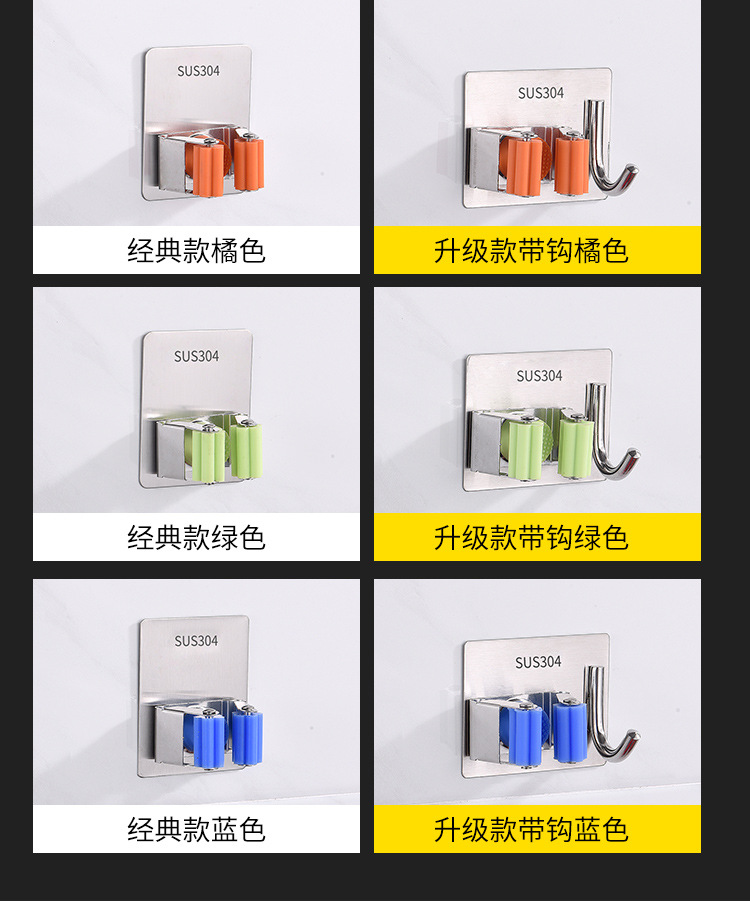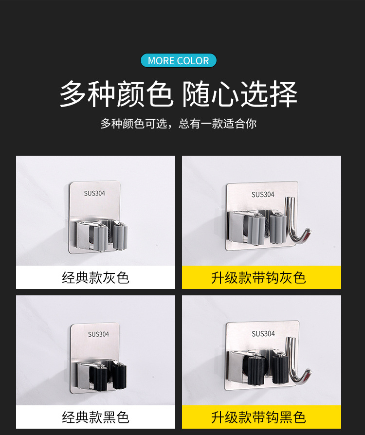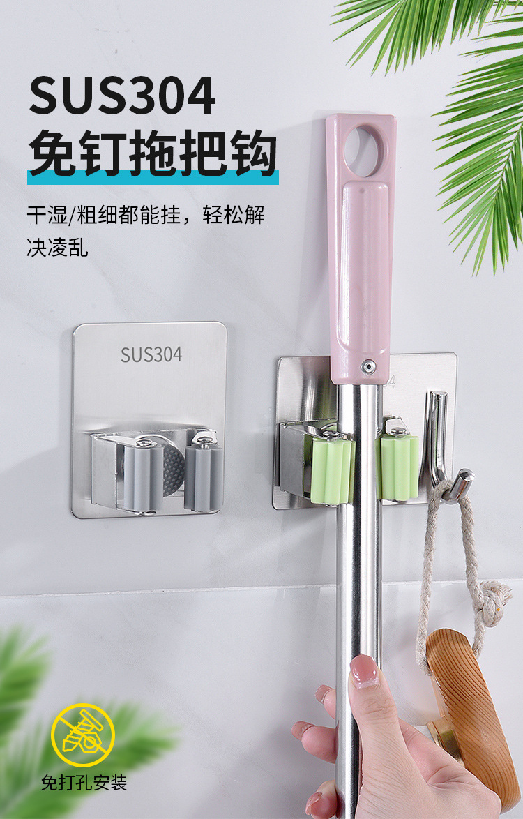 艾逊订货号:A1060259 原始型号:庄太太 灰色带钩 304不锈钢拖把夹挂钩免打孔卫生间扫把挂架粘胶ZTT8049 品牌:庄太太 品牌所属地:中国