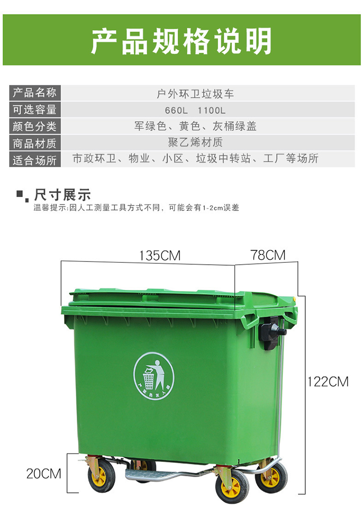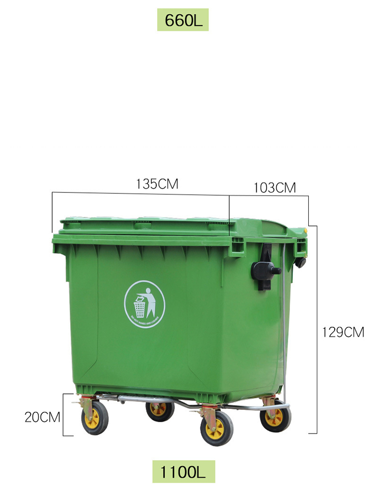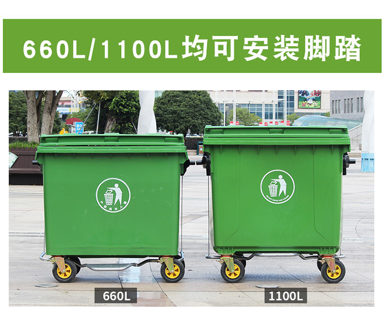 艾逊订货号:K1023979 原始型号:劳保佳 垃圾车 大型环卫垃圾桶 塑料大号市政垃圾车加厚垃圾车 绿色 660L加厚 品牌:劳保佳 品牌所属地:中国