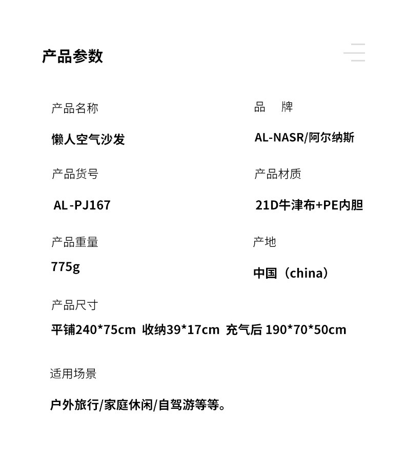 AL-NASR/阿尔纳斯的抗疲劳地垫AL-NASR户外旅行出游懒人充气沙发充气床便携免打气野餐露营郊游午休可折叠收纳蓝色