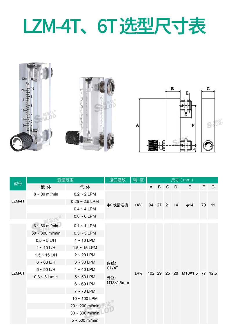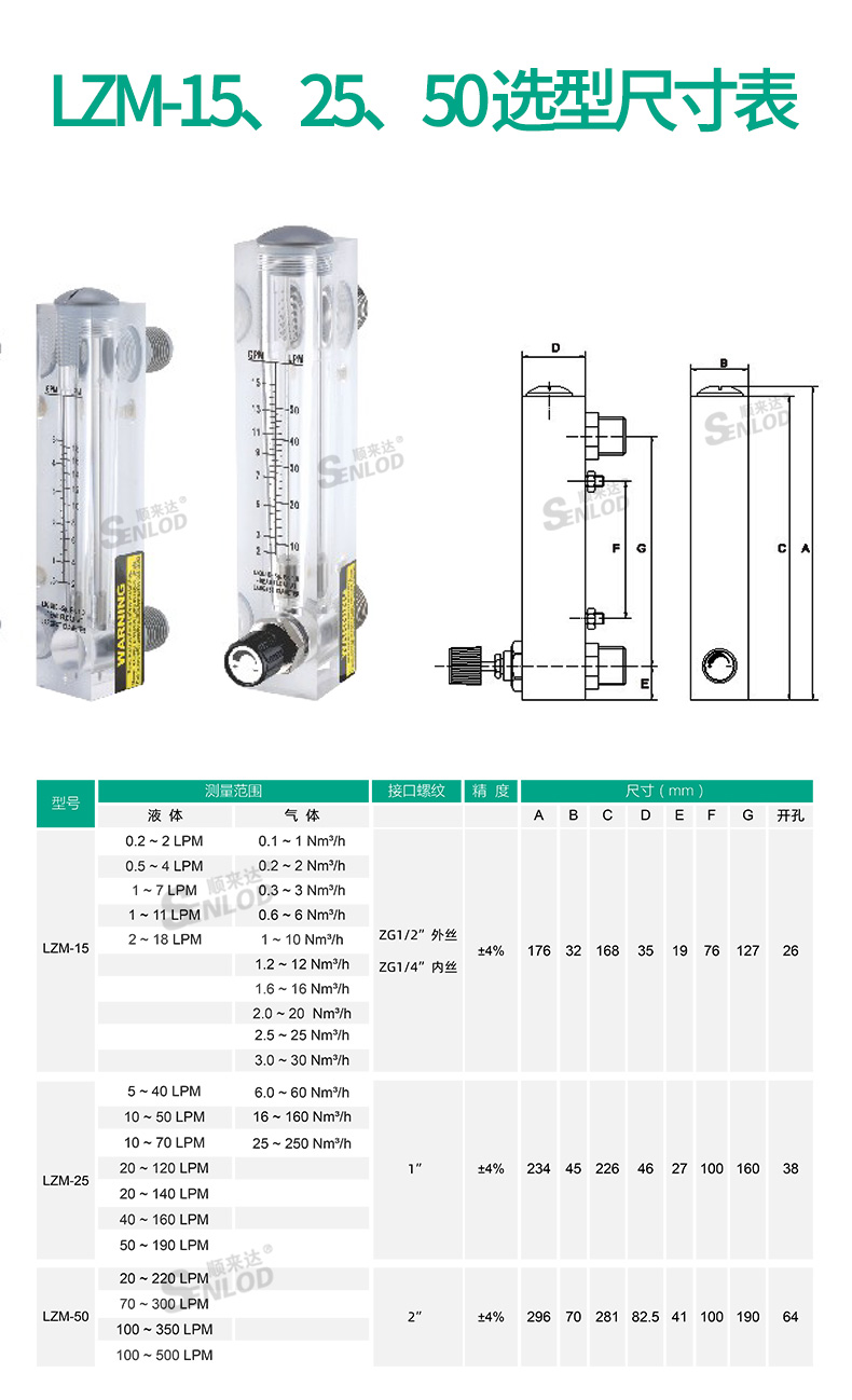 顺来达 管道式转子流量计 有机玻璃流量计 管道式 气体液体流量计 LZM-15G 液体 2-18 L/min |