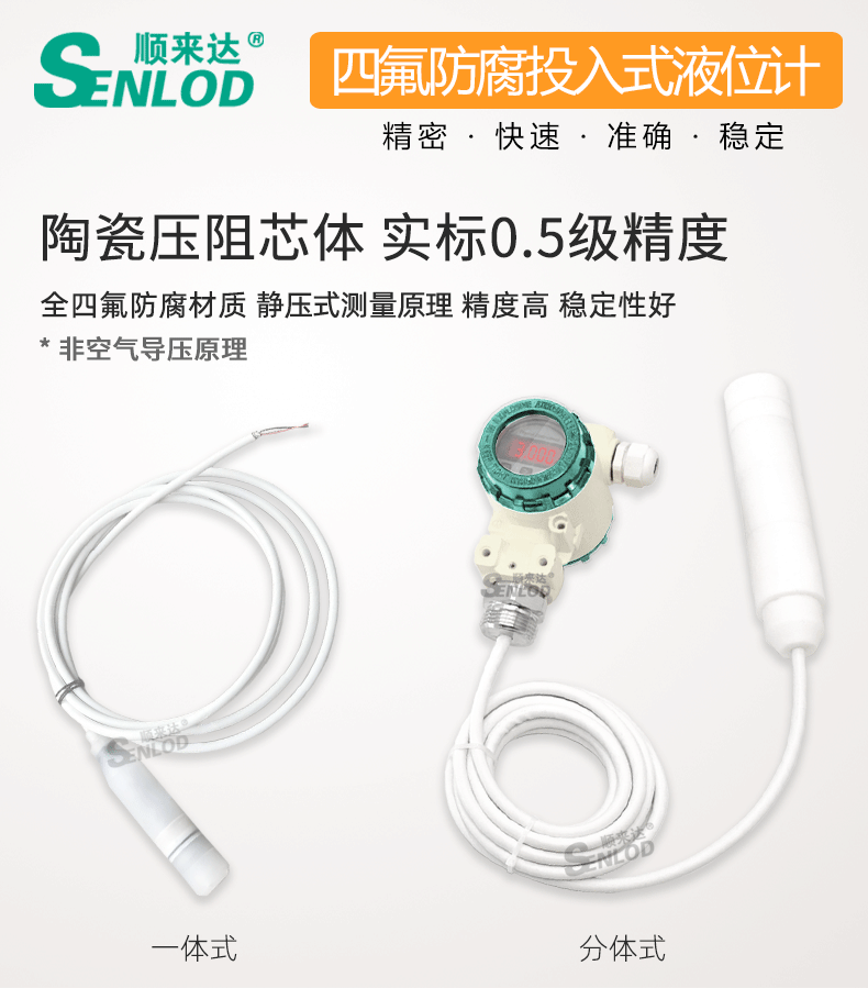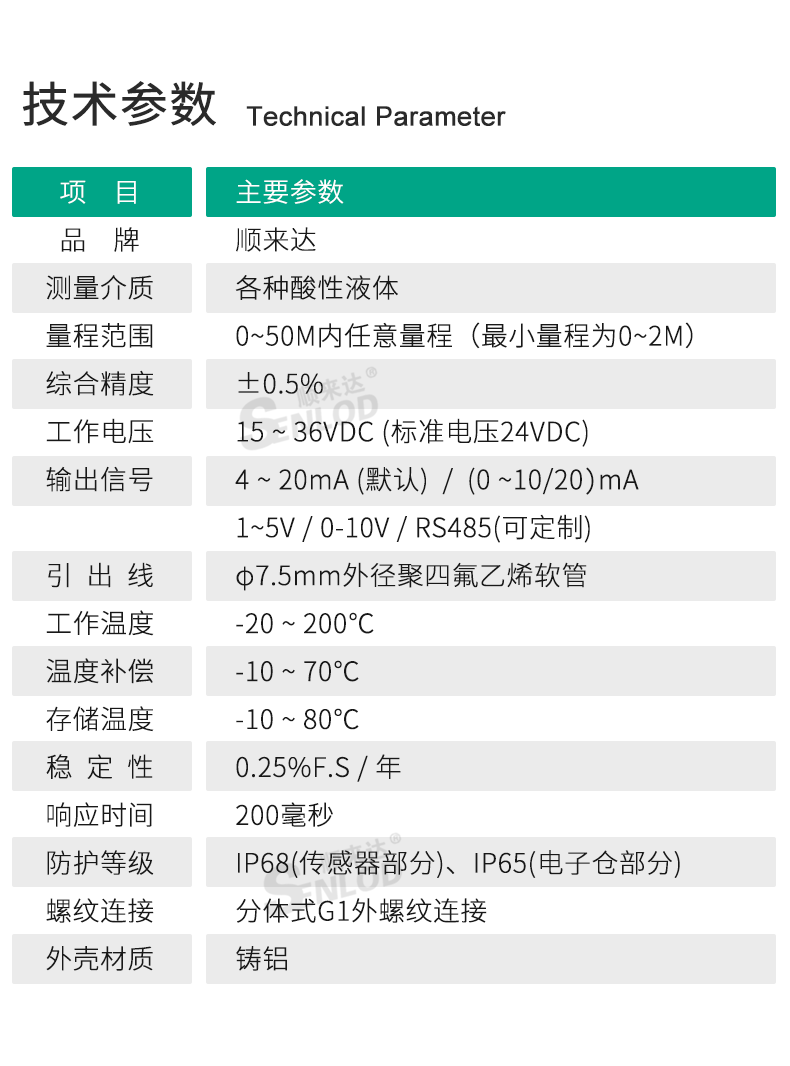 顺来达投入式耐腐蚀液位计液位变送器四氟防腐液位变送器陶瓷膜片4-20MA 定制不锈钢 PE塑料 四氟材质法蓝连接型 具体联系 |