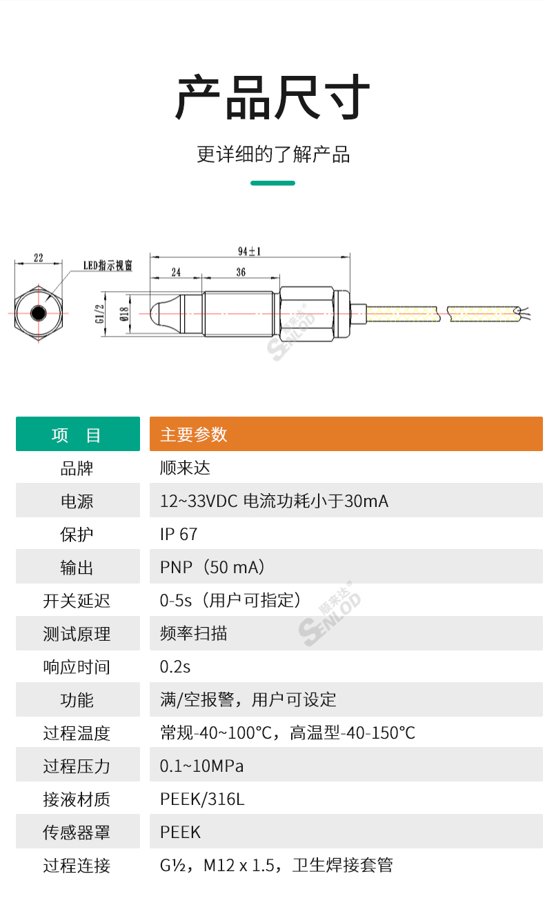 SENLOD/顺来达的电容物位开关顺来达微波物位开关粘稠料位开关油水位界面固体物料粉尘开关报警控制器卫生卡盘型