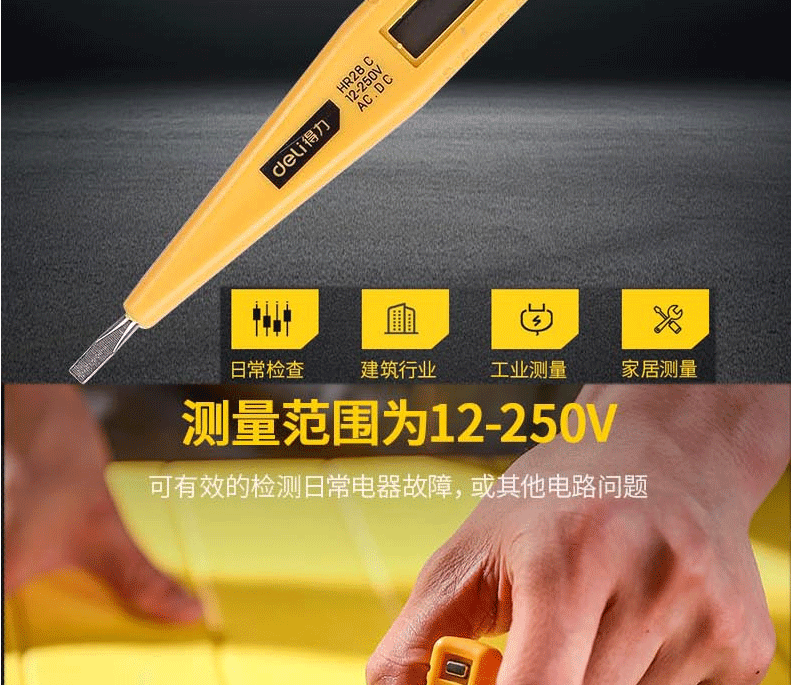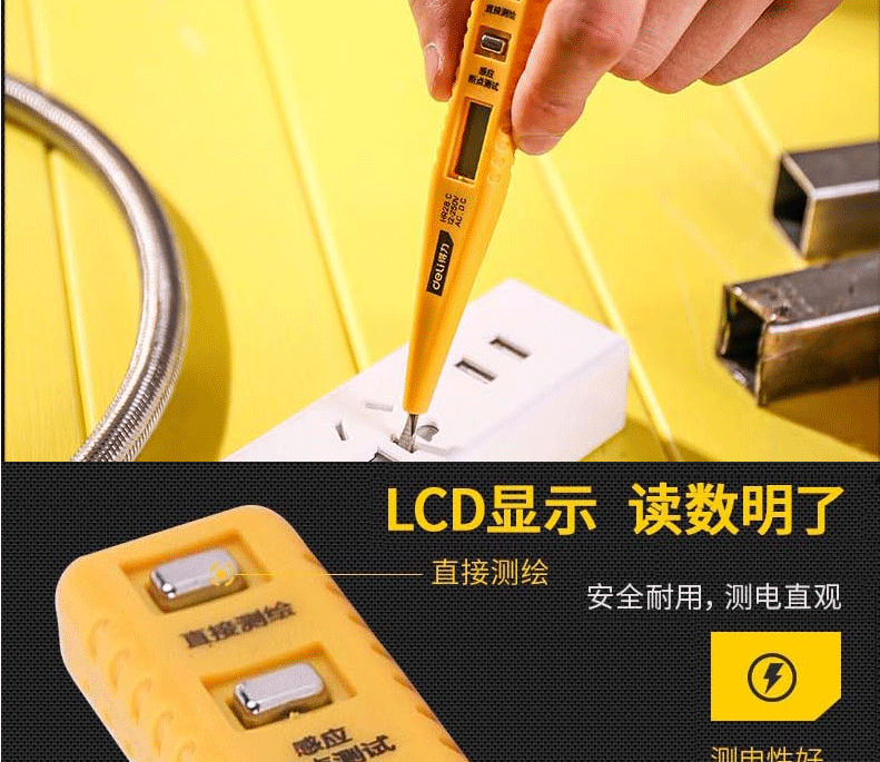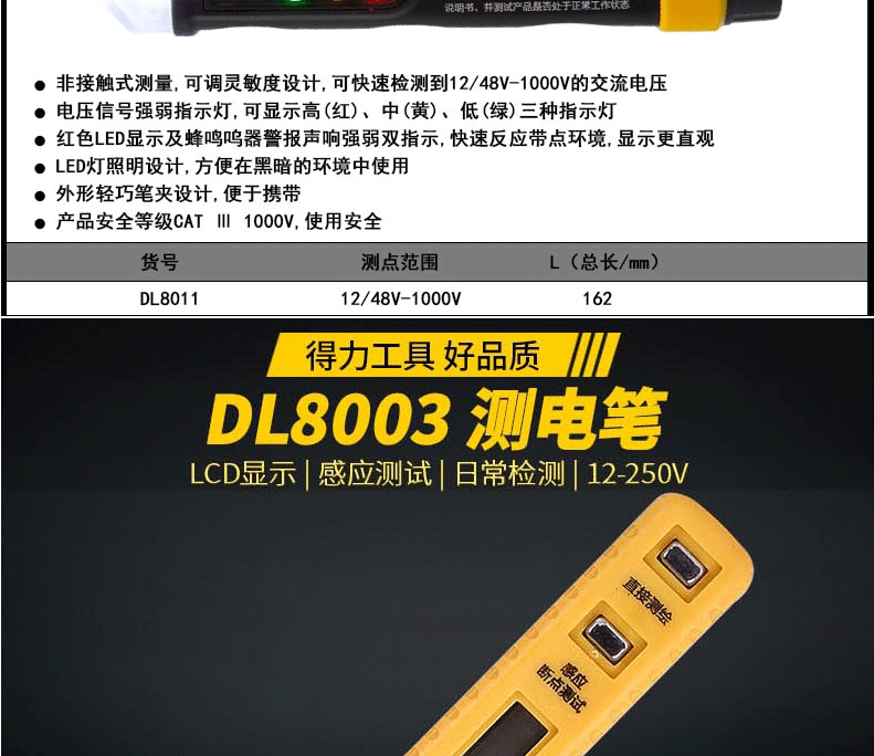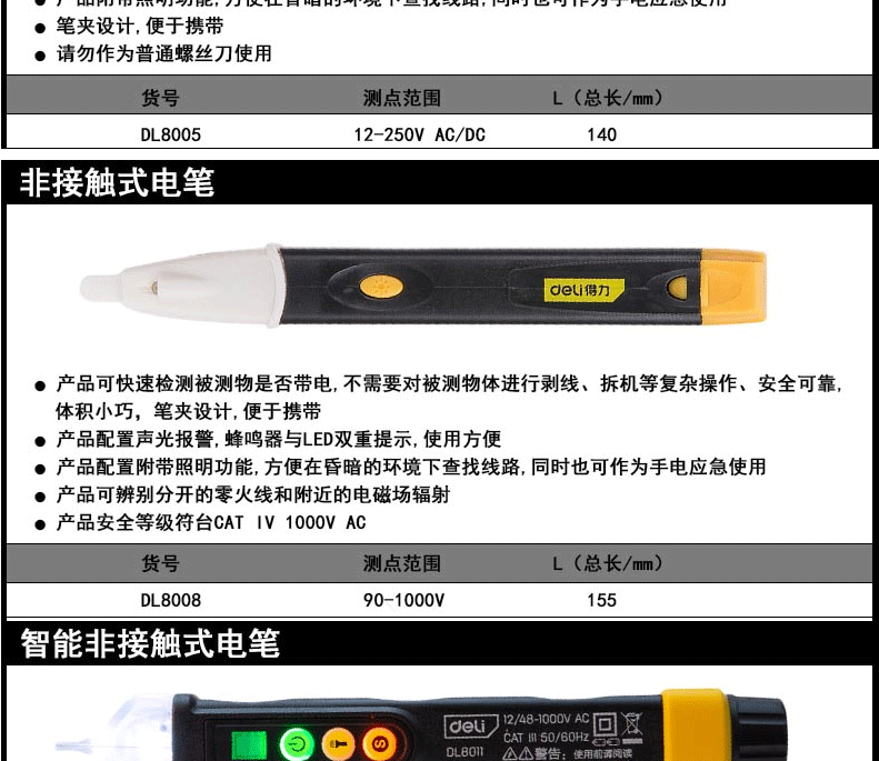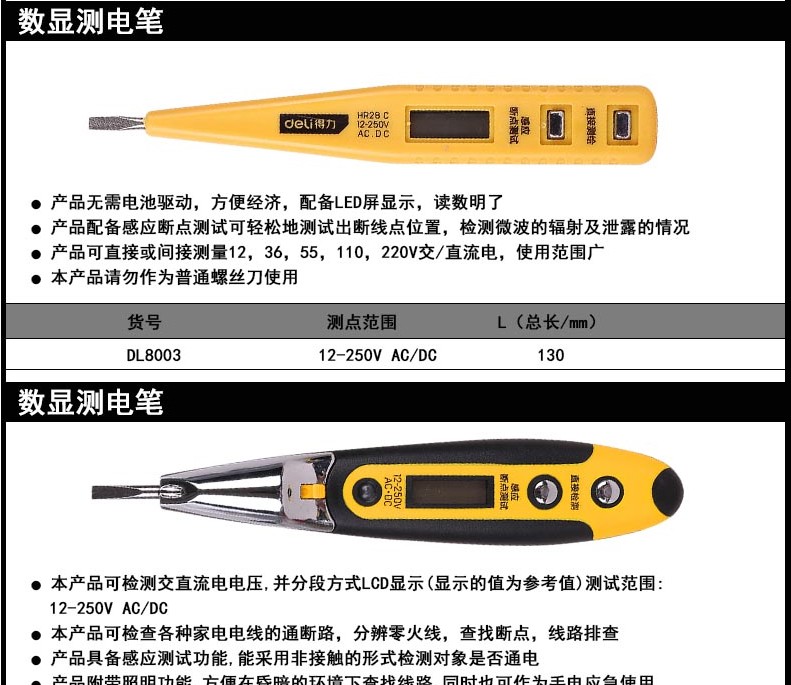 艾逊订货号:F1078622 原始型号:得力(deli)测电笔感应数显多功能测电笔螺丝刀验电笔非接触式验电笔 12-250V数显电笔 DL8003 品牌:deli/得力 品牌所属地:中国