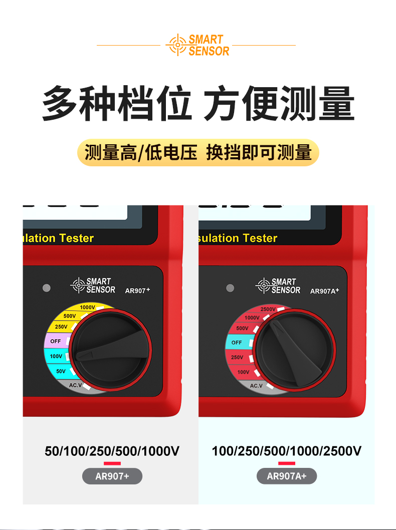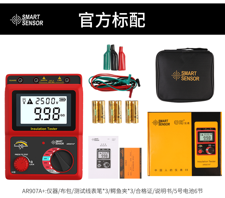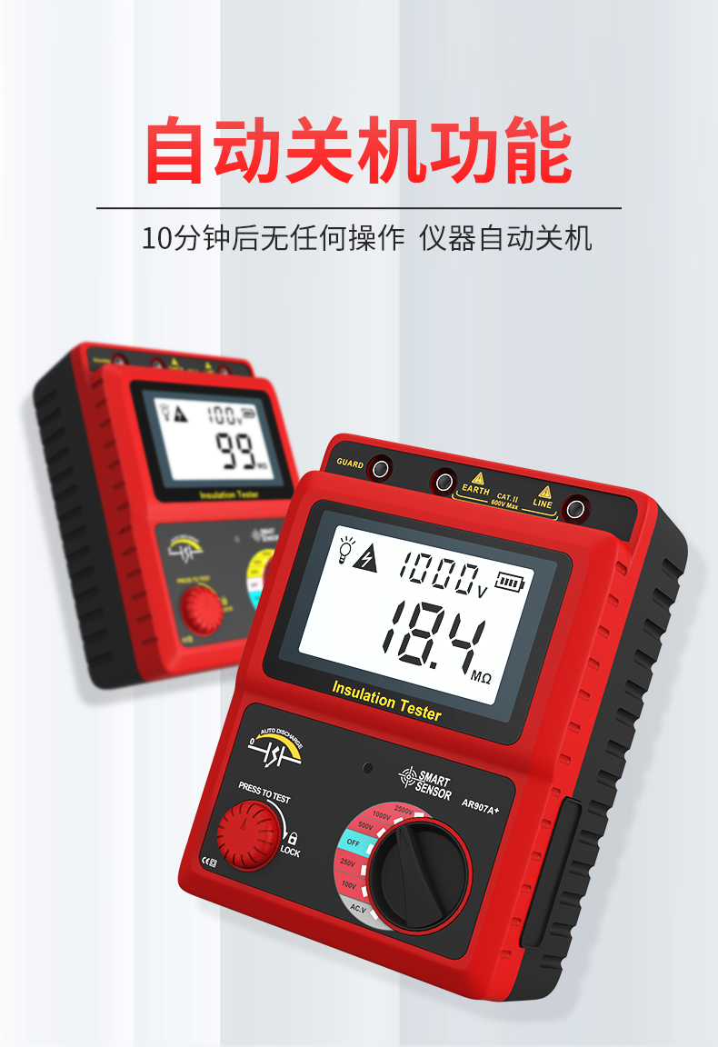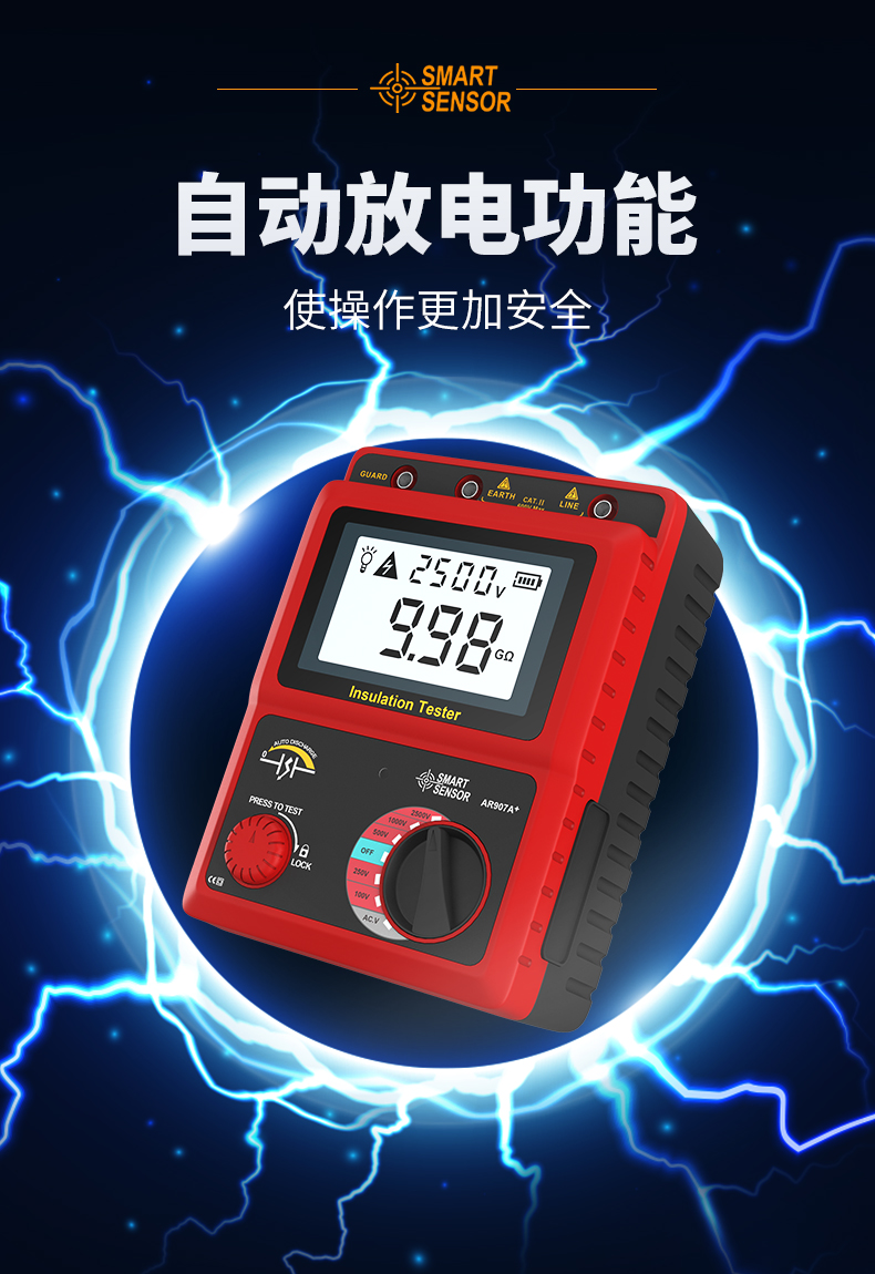 艾逊订货号:F1078624 原始型号:希玛 绝缘电阻测试仪摇表 AR907A+ 100V/250V/500V/1000V/2500V 品牌:SMART SENSOR/希玛 品牌所属地:中国