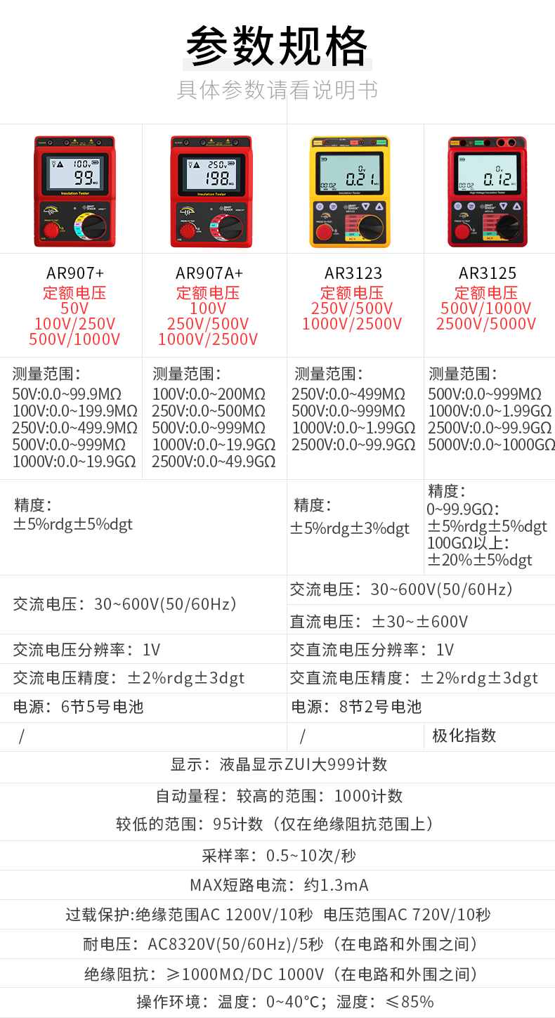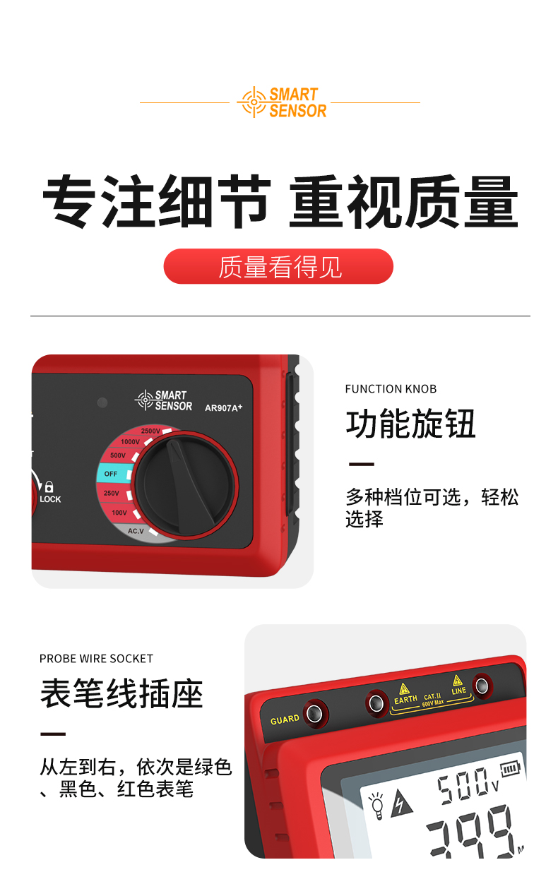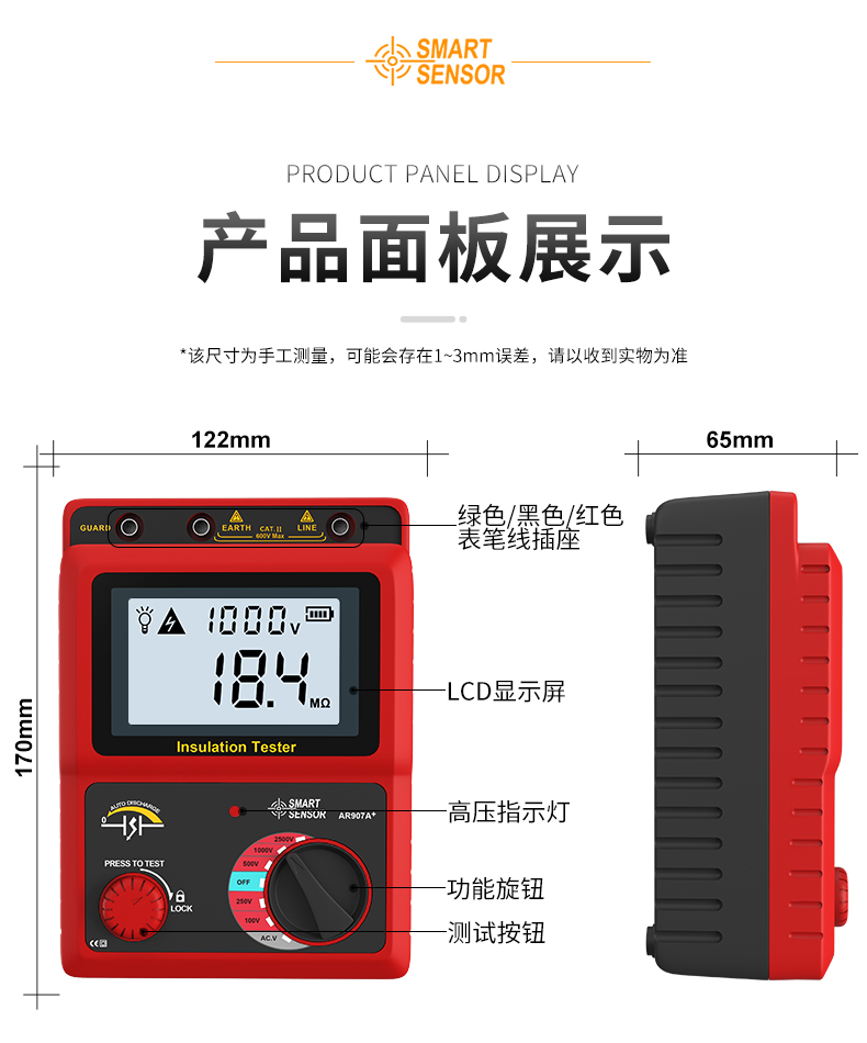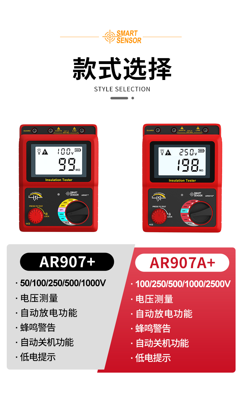 艾逊订货号:F1078624 原始型号:希玛 绝缘电阻测试仪摇表 AR907A+ 100V/250V/500V/1000V/2500V 品牌:SMART SENSOR/希玛 品牌所属地:中国