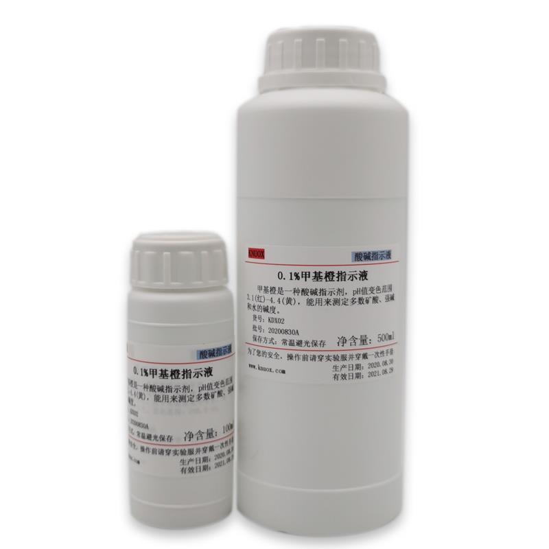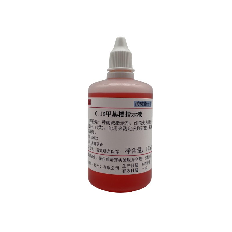 艾逊订货号:I1010112 原始型号:0.1%甲基橙指示剂1g/L指示液酸碱指示剂金橙莲D锅炉水质化验100ml 100ml(滴瓶装) 品牌:萧试 品牌所属地:中国