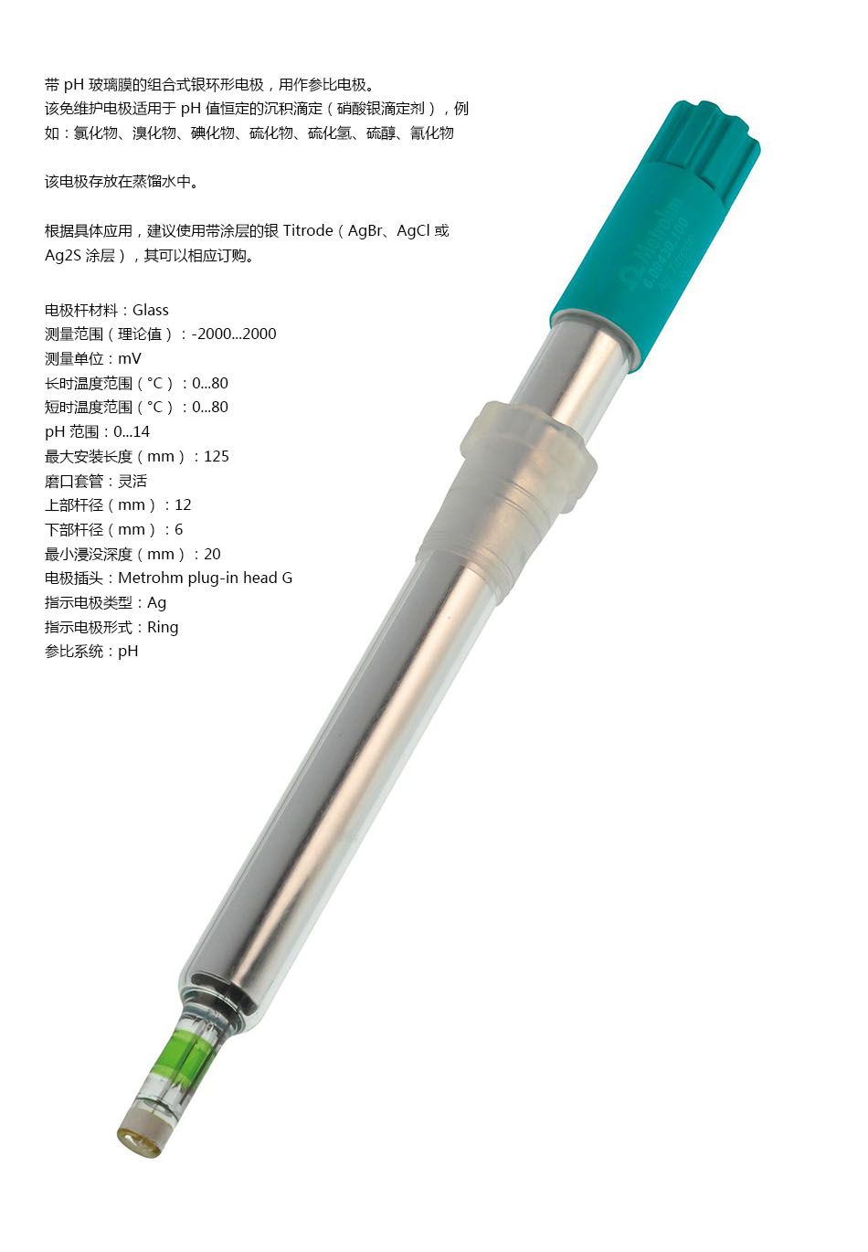 应用领域:该免维护电极适用于 pH 值恒定的沉积滴定(硝酸银滴定剂); 酸/碱范围: 0-14; 电极材质: 玻璃; 连接材质: Metrohm plug-in head G; 尺寸:125mm; 额定温度:0℃-80℃; 类型:银(Ag)/pH ;