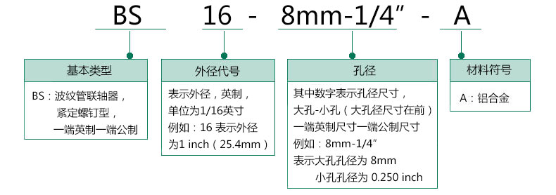 Ruland BS-波纹管联轴器,紧定螺钉式,一端英制一端公制,铝合金,BS32-5/8"-13MM-A |