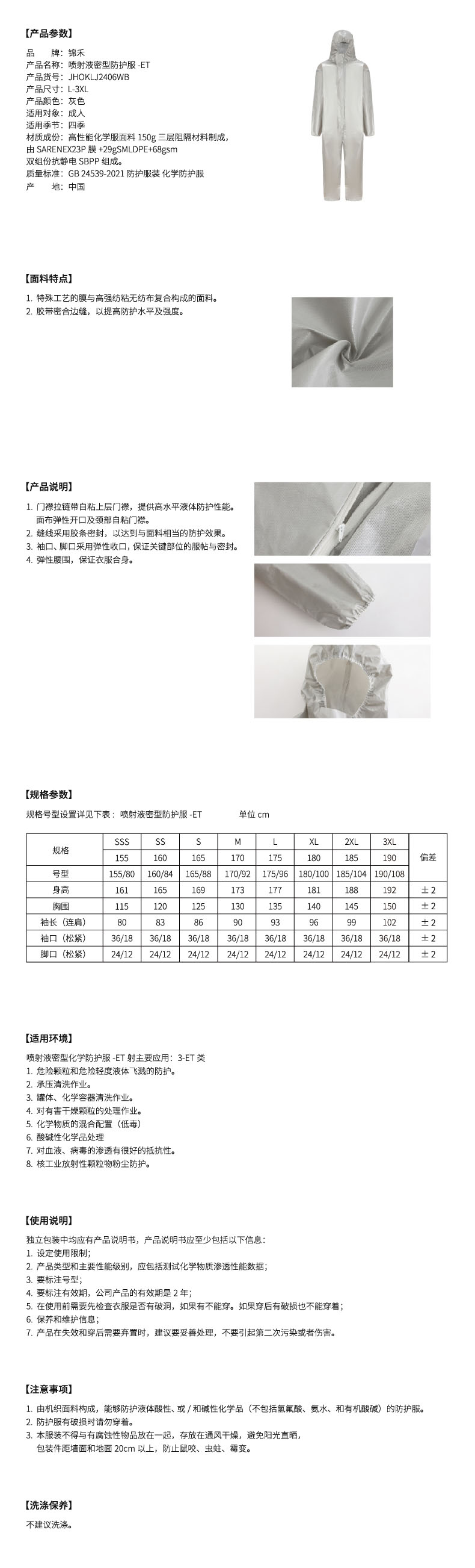 艾逊订货号:J1027846 原始型号:JHOKLJ2406WB 喷射液密型防护服-ET 品牌:锦禾 品牌所属地:国产