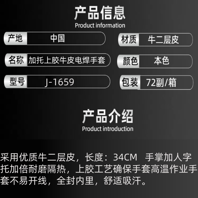 艾逊订货号:J1027901 原始型号:J-1659 本色.长34CM 手掌宽14CM.杂绒全封内里.双层电焊手套.防烫、耐磨、防割、防穿刺、防开线 品牌:威仕盾 品牌所属地:中国