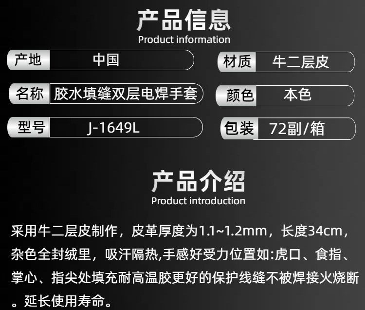艾逊订货号:J1027902 原始型号:J-1649L 本色.长34CM 手掌宽14CM.杂绒全封内里.双层电焊手套.防烫、耐磨、防割、防穿刺、防开线 品牌:威仕盾 品牌所属地:中国