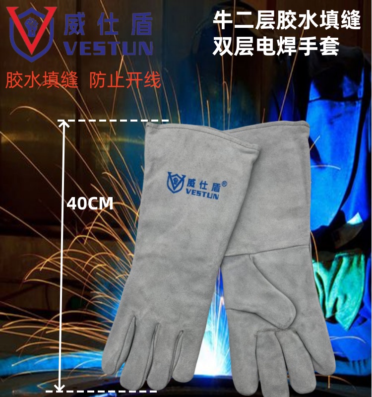 威仕盾的焊接手套牛二层胶水填缝双层电焊手套40CM