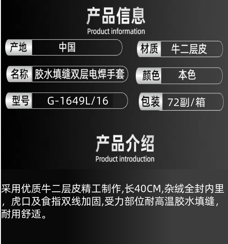 艾逊订货号:J1027916 原始型号:J-1649L/16 本色.长40CM 手掌宽15CM.双层电焊手套.防烫、耐磨、防割、防穿刺、防开线 品牌:威仕盾 品牌所属地:中国