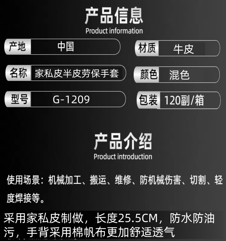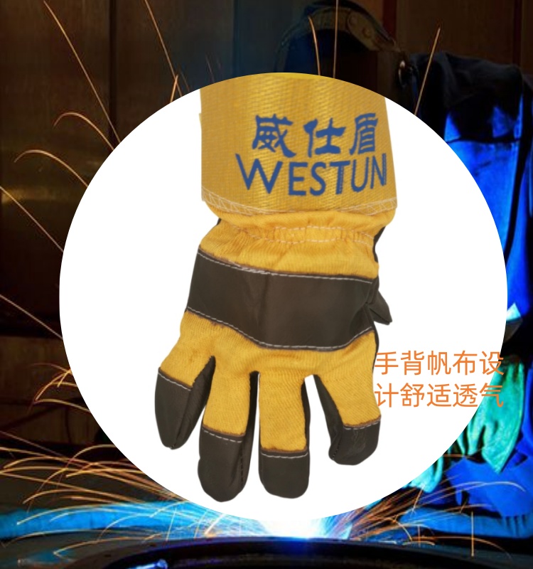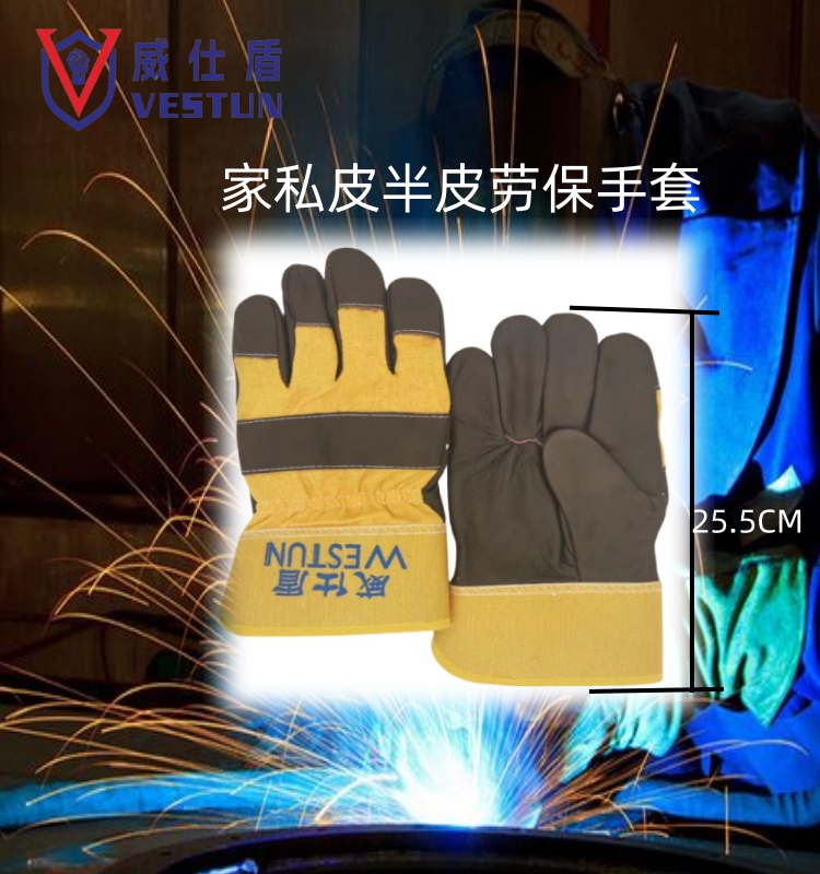 艾逊订货号:J1027927 原始型号:G-1209 混色.长26CM手掌宽13CM.家私皮混色半皮手套.防水防油污 品牌:威仕盾 品牌所属地:中国