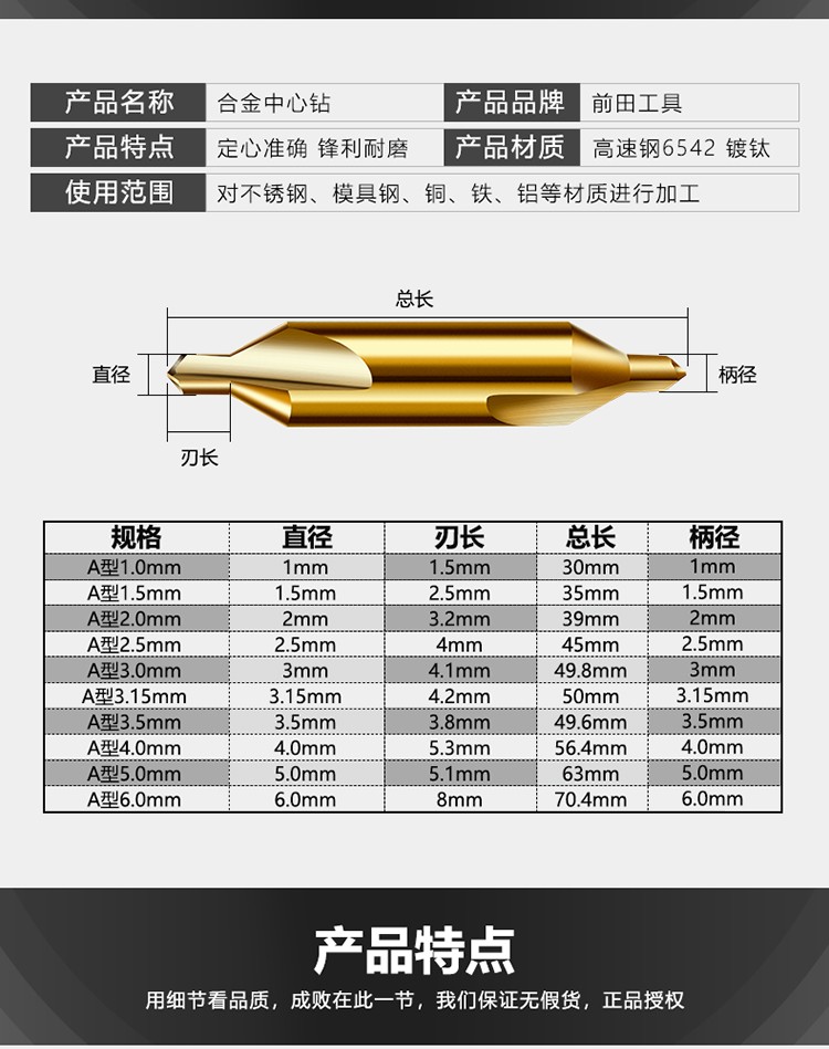 TONE/前田的电动装配工具前田工具镀钛中心钻头不锈钢用加工中心钻3mm【A型】