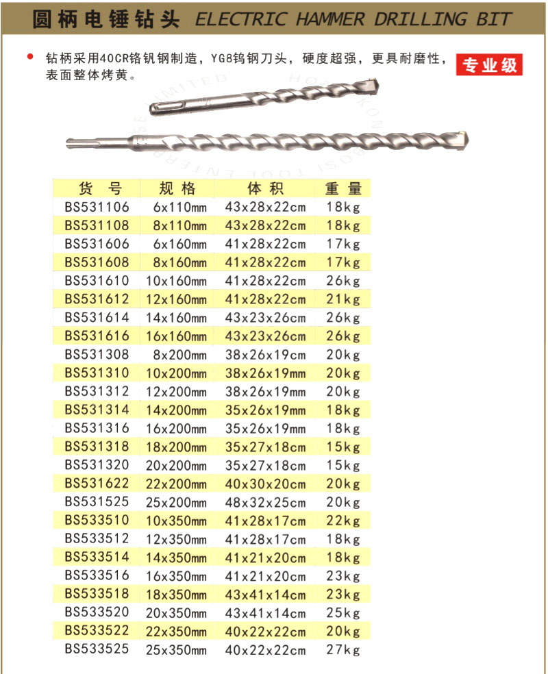 BOSI/波斯的气动冲击工具圆柄电锤钻头,6*160mm,BS531606