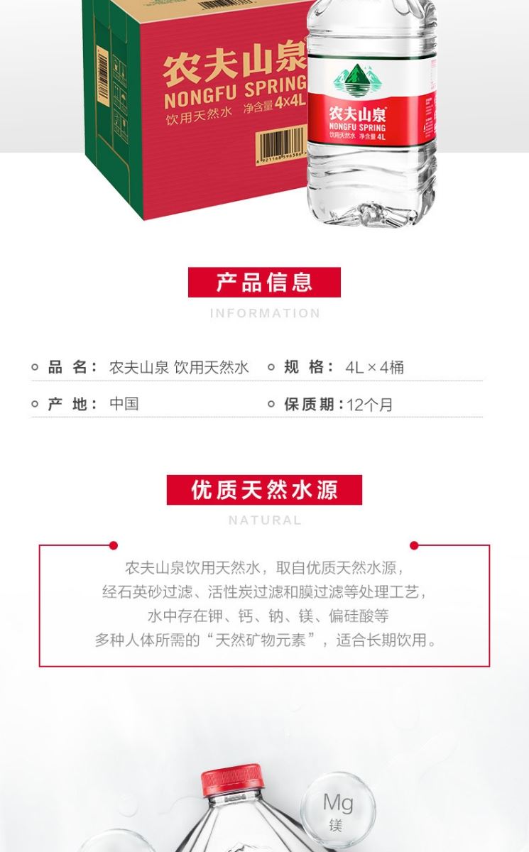 艾逊订货号:H1001999 原始型号:农夫山泉饮用天然水 4L*4桶 品牌:农夫山泉 品牌所属地:中国