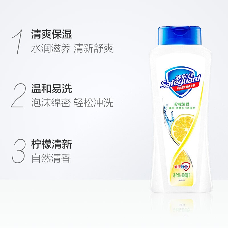 艾逊订货号:K1000919 原始型号:舒肤佳 沐浴露400g 品牌:SAFEGUARD/舒肤佳 品牌所属地:中国