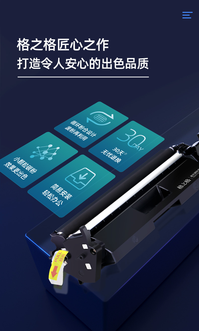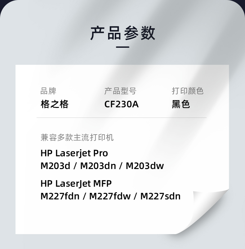 艾逊订货号:K1000931 原始型号:格之格;CF230A;硒鼓NT-PNH230C;不带芯片;适用惠普M203d M203dn M203dw M227fdn M277fdw M277sdn打印机粉盒专业装 品牌:格之格 品牌所属地:中国