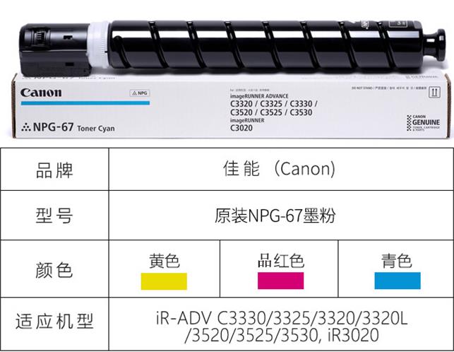 佳能(Canon)NPG-67 蓝色墨粉盒(适用C3330/C3320/C3020/C3520/C3120L/C3125)标准装19000页/盒 |