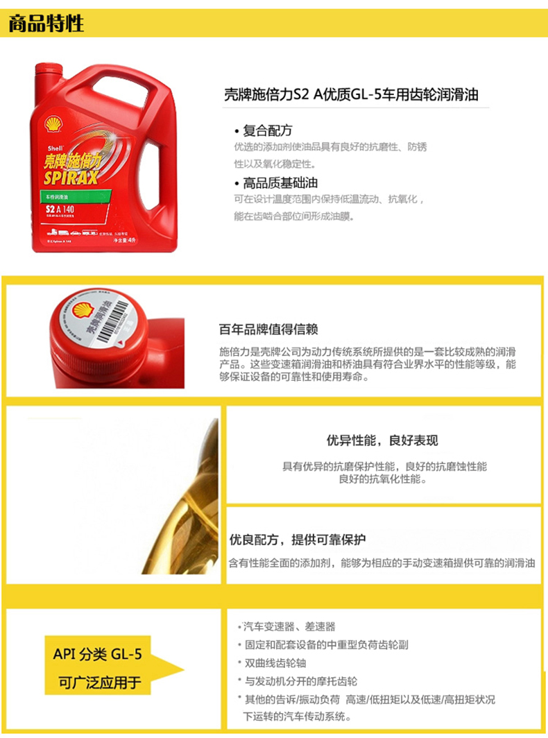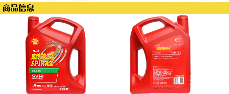 艾逊订货号:H1002804 原始型号:壳牌 变速箱油,Spirax S2A 85W-140,4L/桶 品牌:Shell/壳牌 品牌所属地:中国