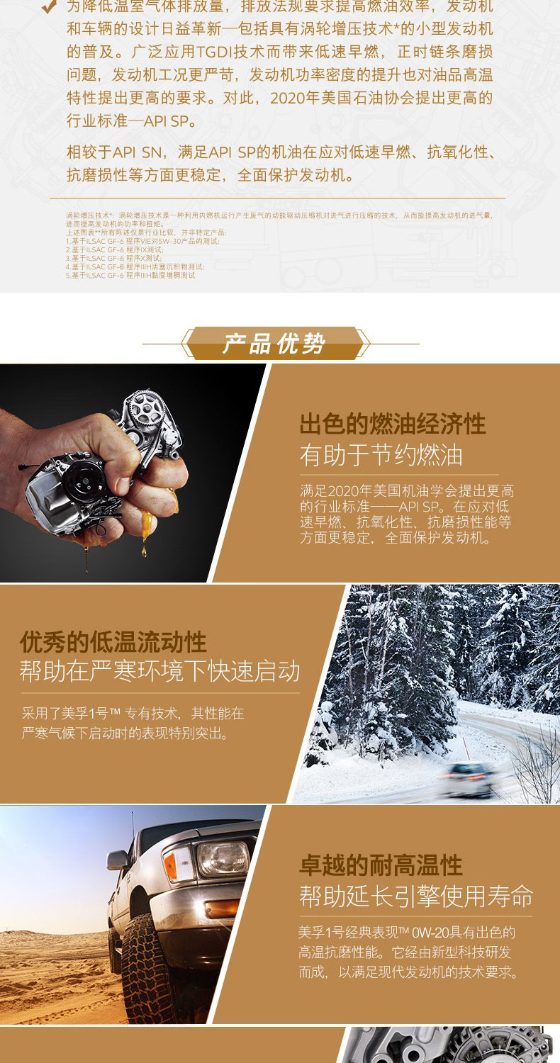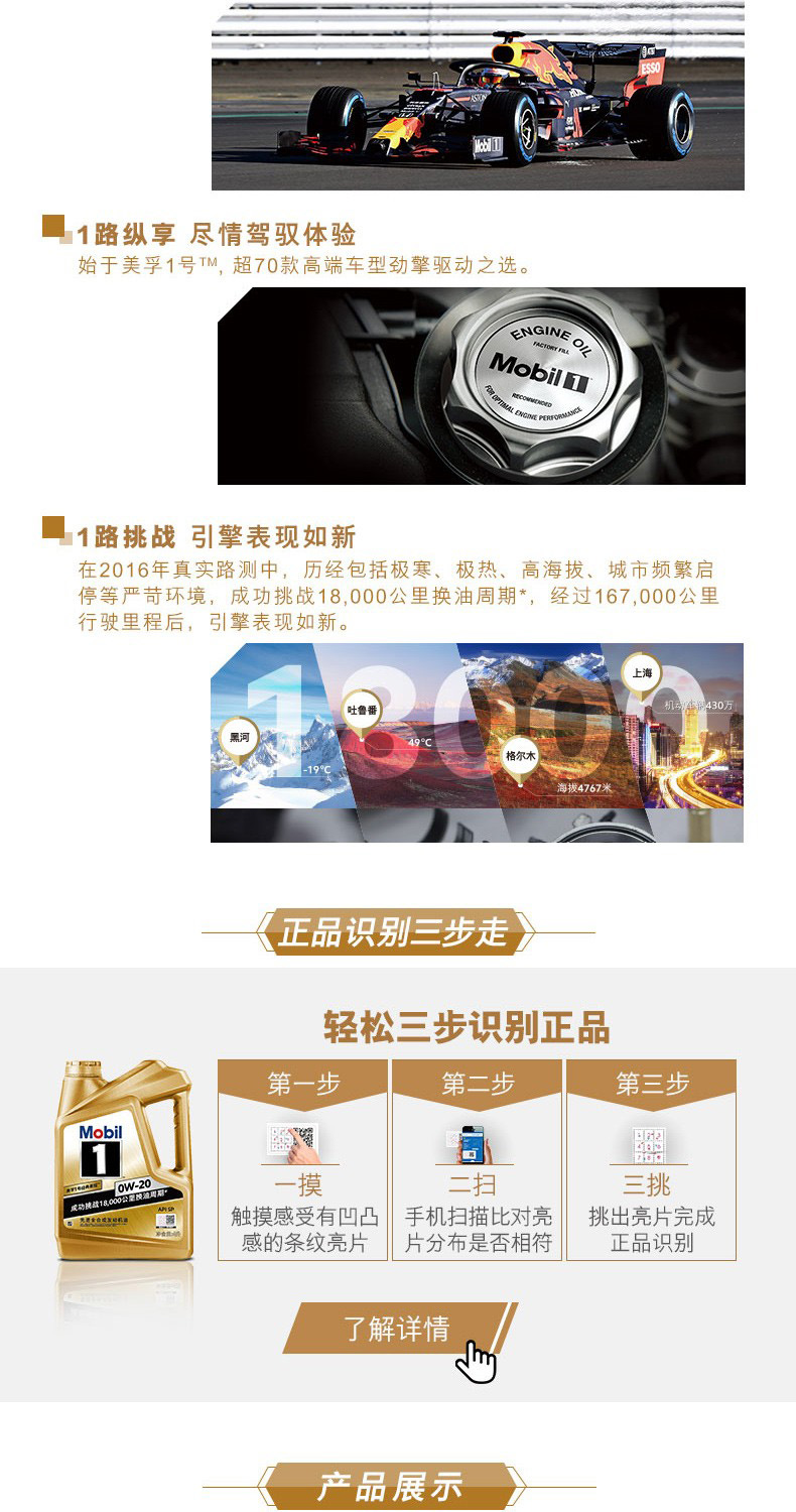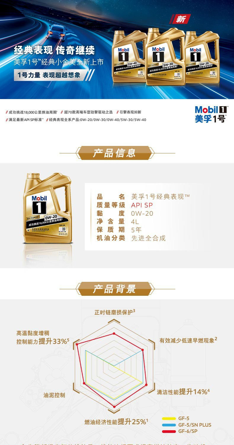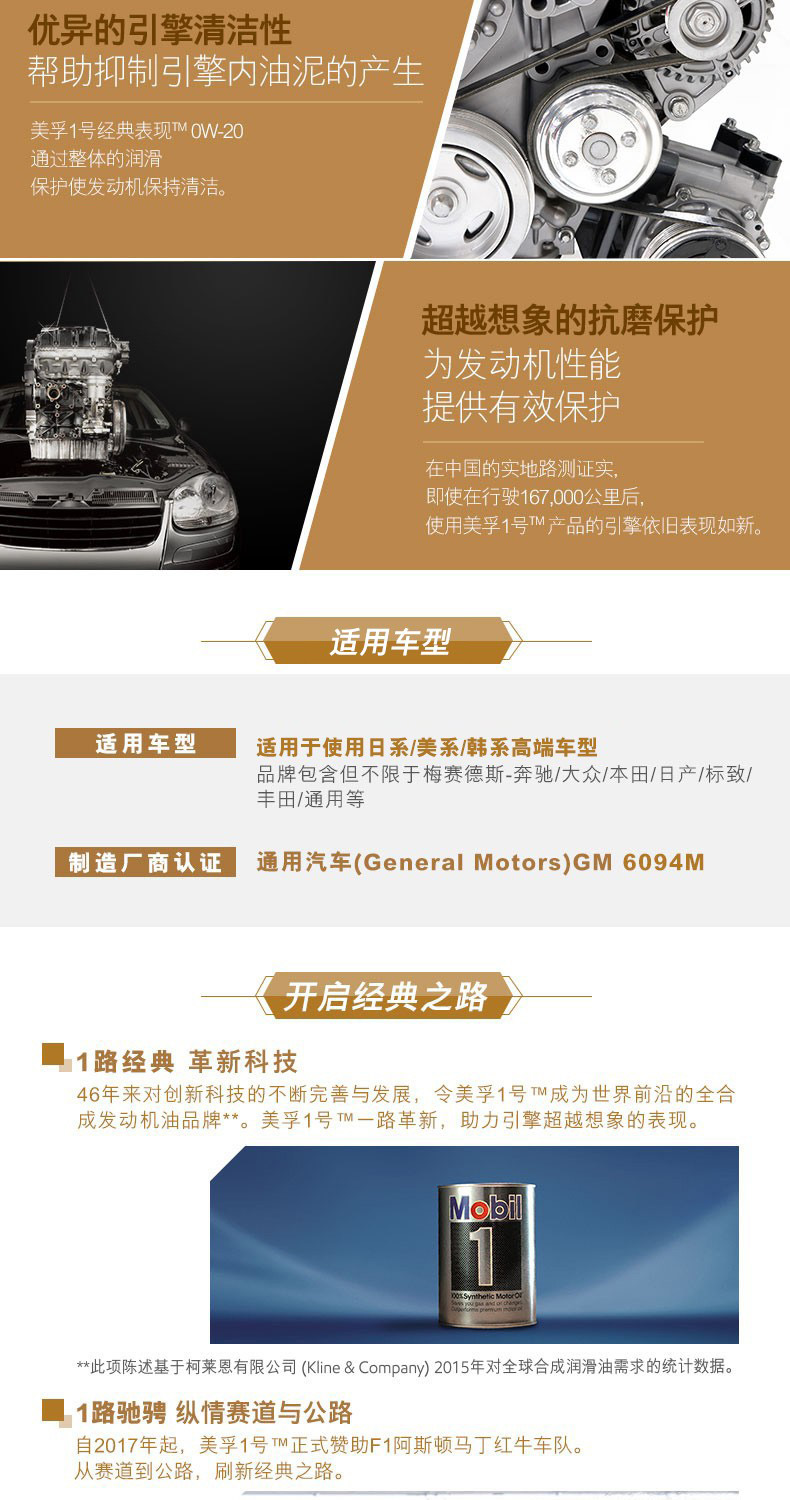 艾逊订货号:H1002975 原始型号:美孚 美孚,美孚1号,金装 0W-20,SN级,4L 品牌:Mobil/美孚 品牌所属地:美国