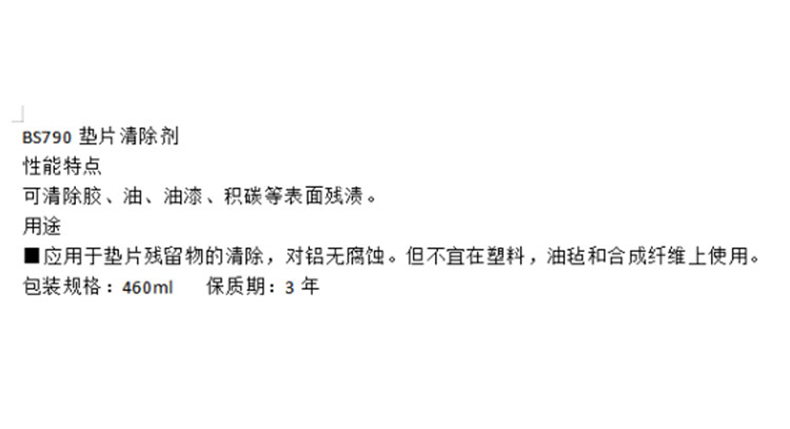应用于垫片残留物的清除,对铝无腐蚀。但不宜在塑料,油毡和合成纤维上使用。