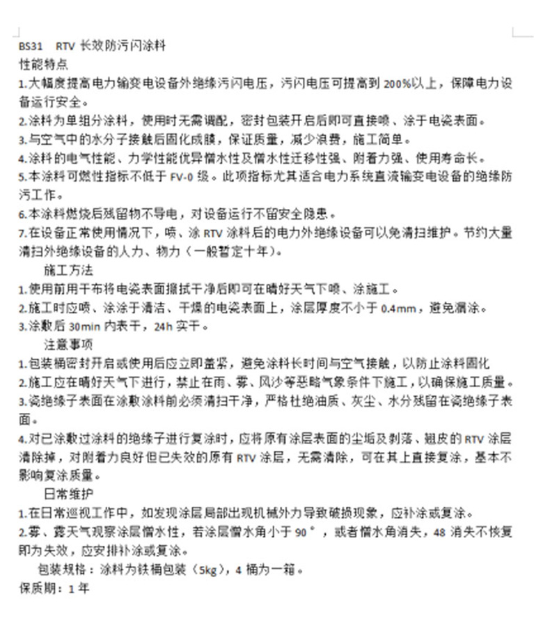 名称:BS31 RTV长效防污闪涂料