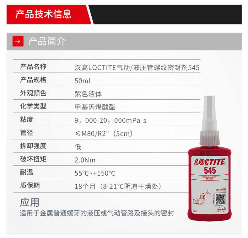 艾逊订货号:H1007774 原始型号:乐泰 Loctite 545/50ml 品牌:Loctite/乐泰 品牌所属地:中国