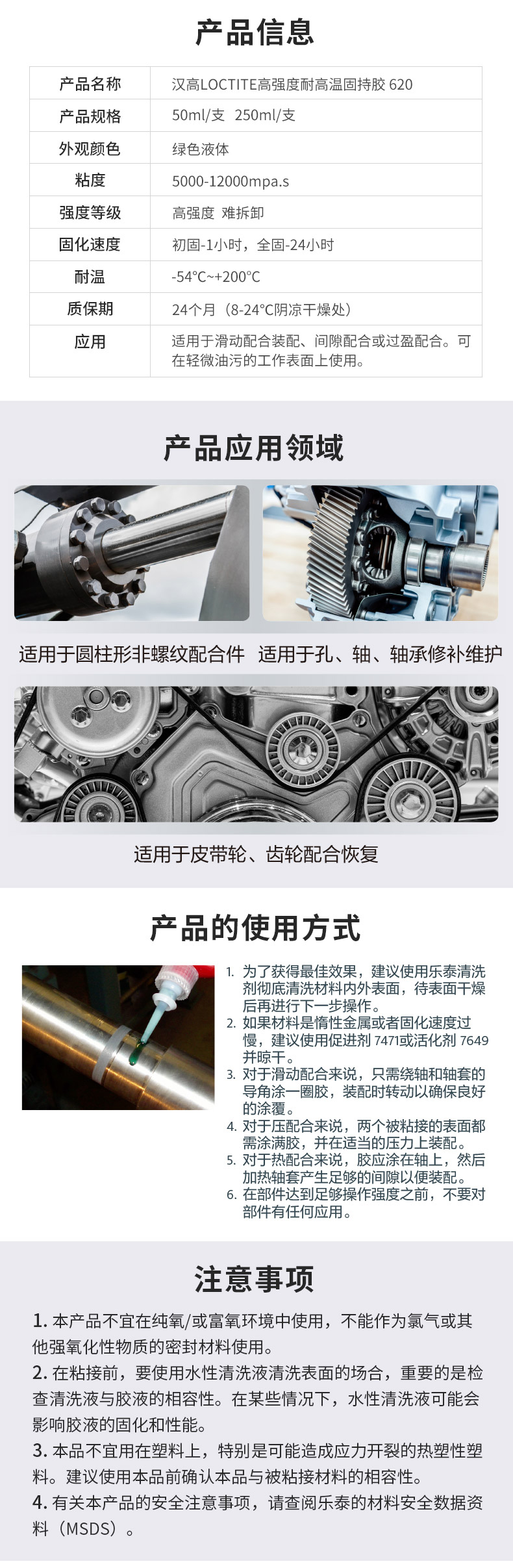 艾逊订货号:H1008138 原始型号:乐泰 Loctite 620/50ml 品牌:Loctite/乐泰 品牌所属地:中国