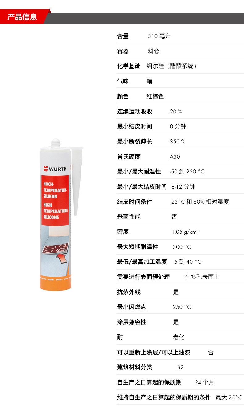 WURTH/伍尔特的硅酮密封胶伍尔特高温硅胶,0892330,红棕色,310ML/支