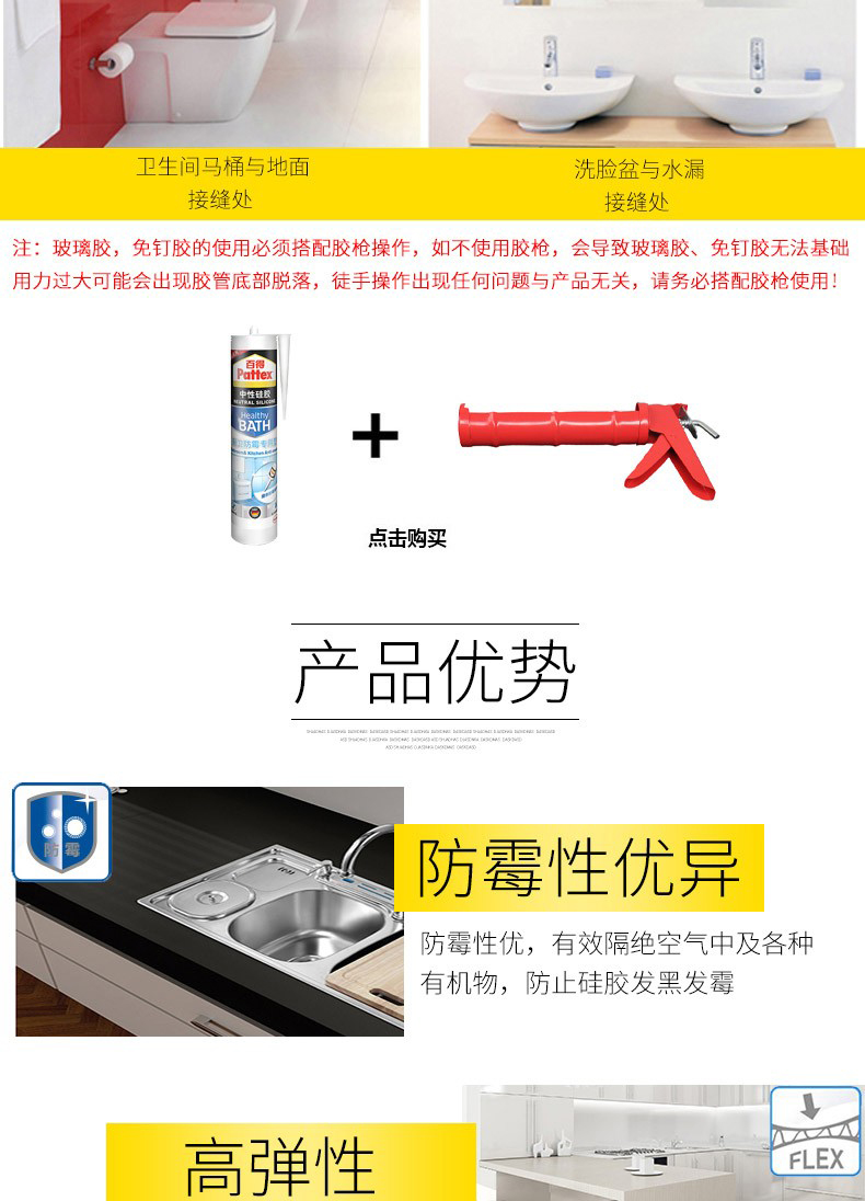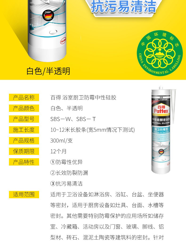 Pattex/百得的硅酮密封胶百得中性硅胶防霉型浴室和厨房专用,SBS-W,白色,300ml/支