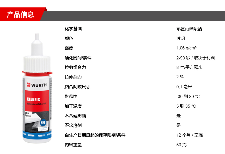 WURTH/伍尔特的瞬间粘结伍尔特快干胶,0893090,50G/支