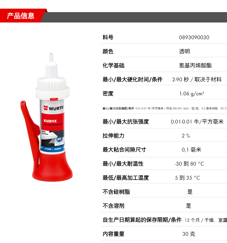 WURTH/伍尔特的瞬间粘结伍尔特强力胶,0893090030,SUPERFAST,PEN,30G/支