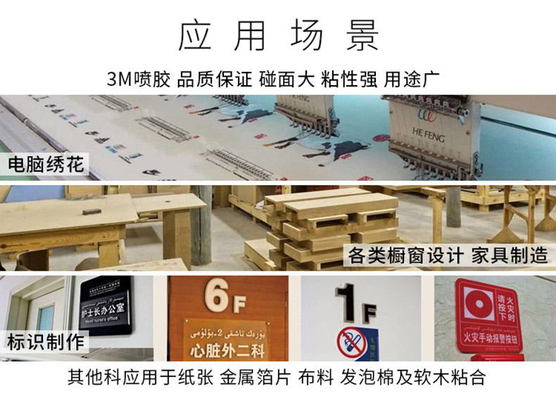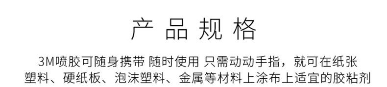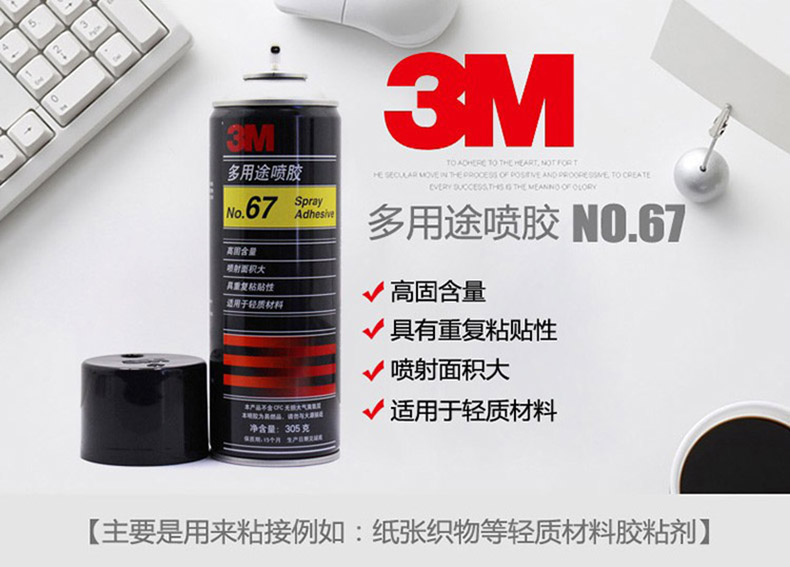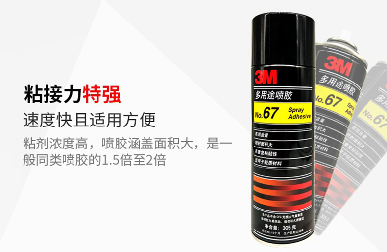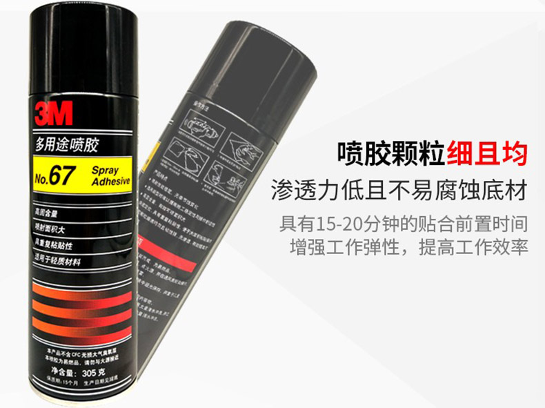 3m 67喷胶主要是用来粘接诸如纸张,织物等轻质材料胶粘剂的特殊配方使之能在一年四季里都呈现出稳定的喷涂性能胶粘剂起粘时间短,有适当的开放时间以满足粘接前的定位要求喷胶颗粒非常细且均匀且粘性强高固含量,且渗透性非常低,与常规的喷胶相比具有更大的喷涂面积。