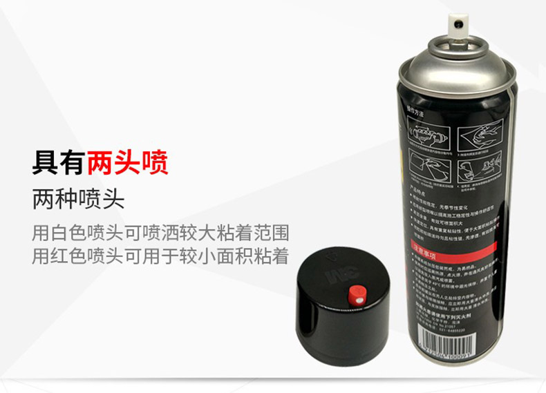 具有两喷头,用白色喷头可喷洒较大粘着范围,用红色喷头可用于较小面积之粘着。