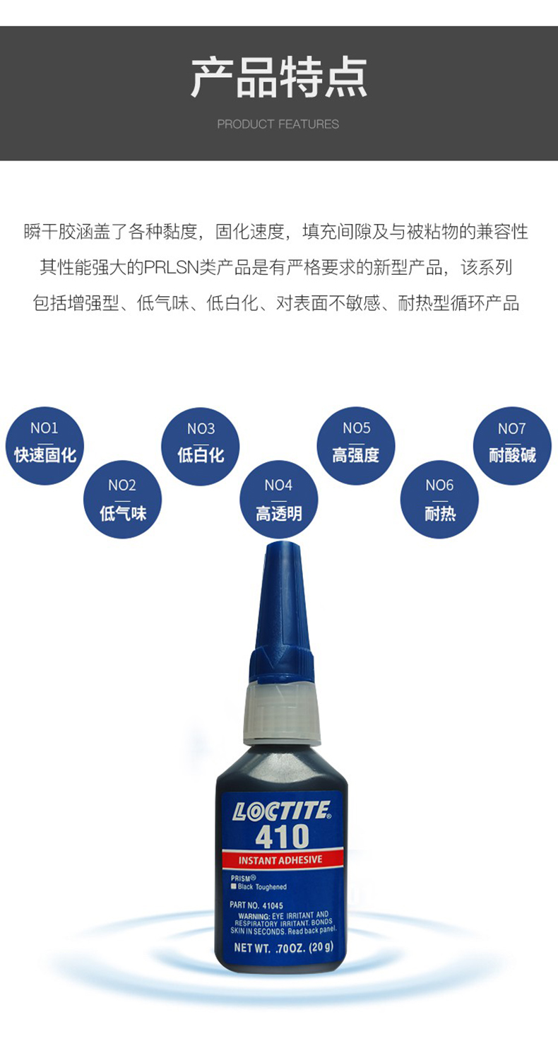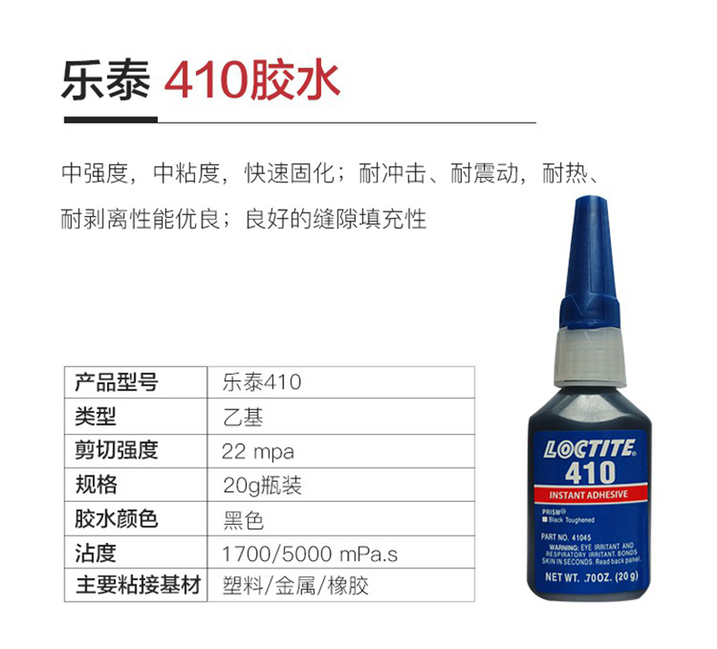 艾逊订货号:H1008488 原始型号:乐泰 Loctite 410/20g 品牌:Loctite/乐泰 品牌所属地:美国