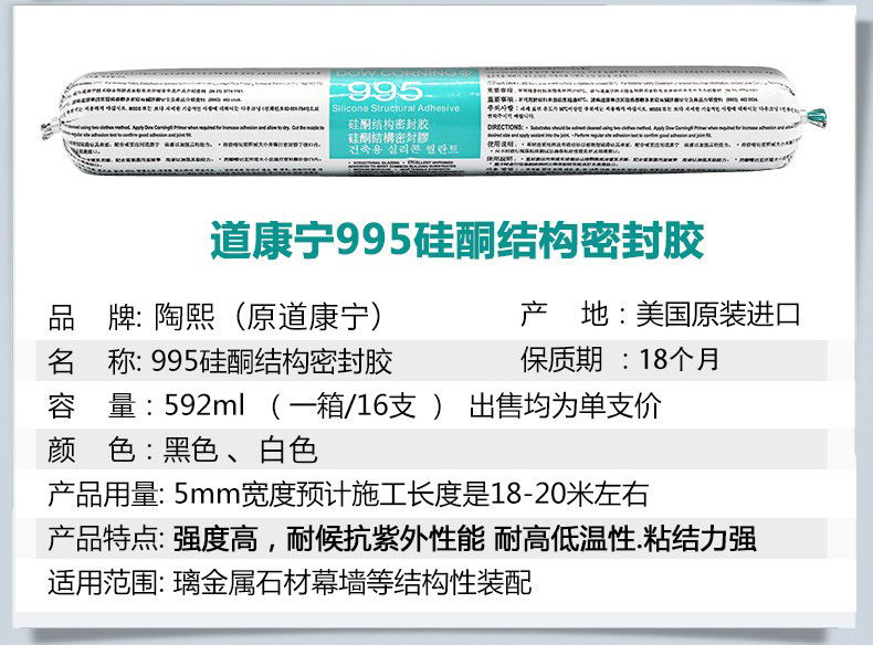 艾逊订货号:H1008590 原始型号:道康宁 995中性硅酮结构密封胶-黑色 品牌:DowCorning/道康宁 品牌所属地:中国