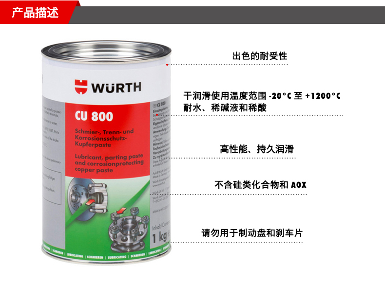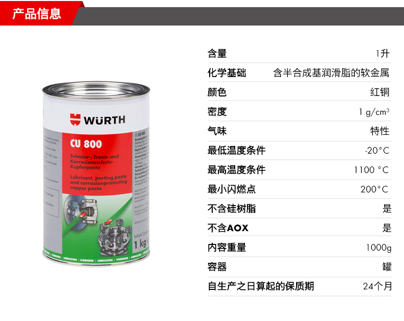 艾逊订货号:H1008657 原始型号:伍尔特 铜800润滑剂,08938002,桶装,1KG/桶 品牌:WURTH/伍尔特 品牌所属地:德国