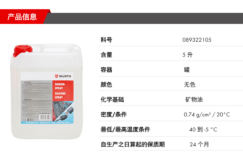 WURTH/伍尔特的特种润滑油伍尔特橡塑保养润滑硅喷剂,089322105,5L/桶