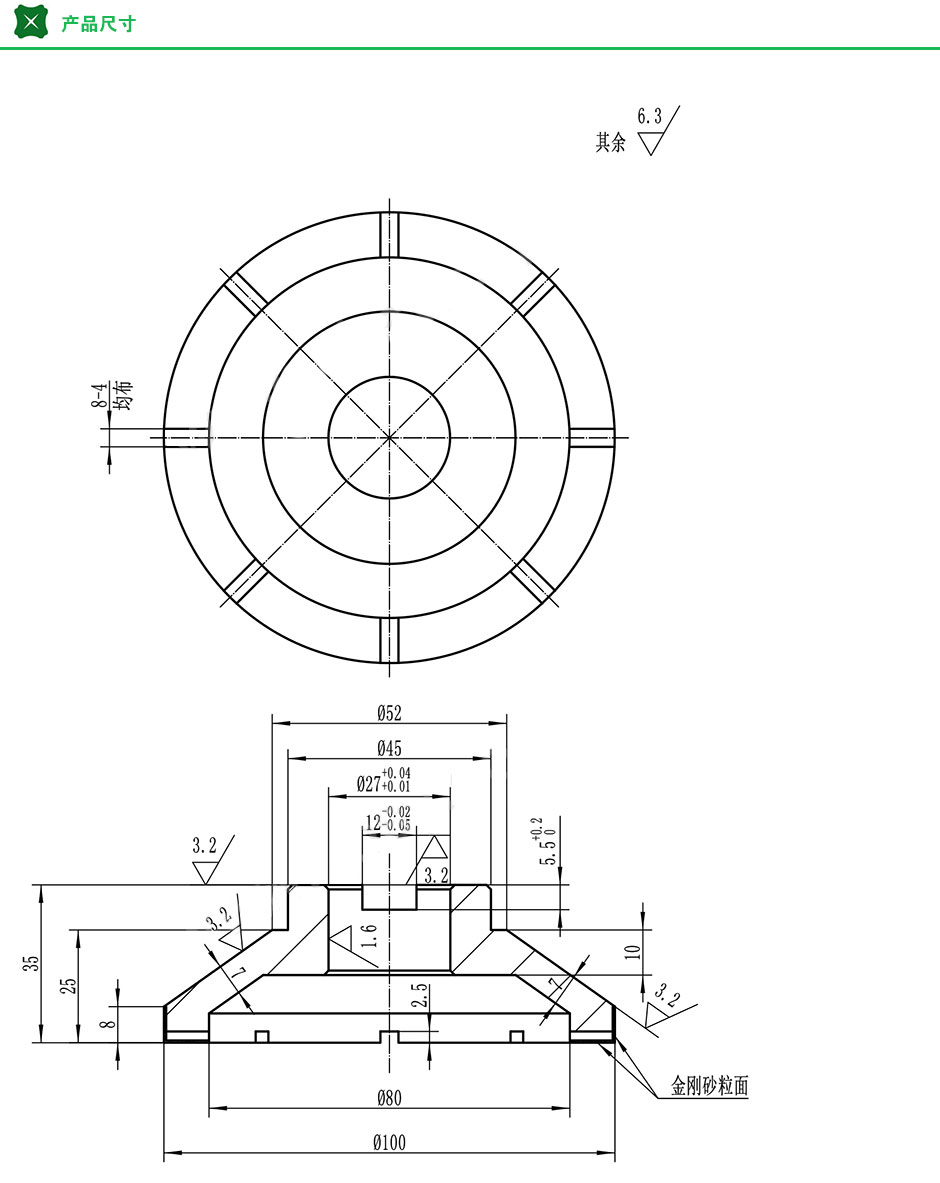 产品介绍 ·砂轮基体用45钢,金刚砂用40目 ·锐边倒钝,未注倒角:1X45° ·未注线性尺寸公差应符合GB/T1804-2000要求 ·未注形位公差应符合GB/T1184-1996要求