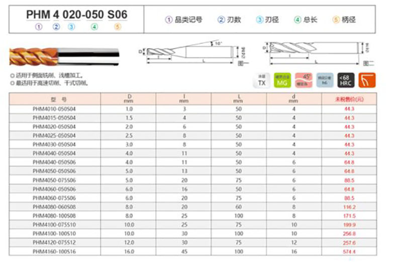 艾逊订货号:C1025453 原始型号:刃天行 整体合金涂层铣刀φ4*50/11,PHM4040-050S04 品牌:刃天行 品牌所属地:日本