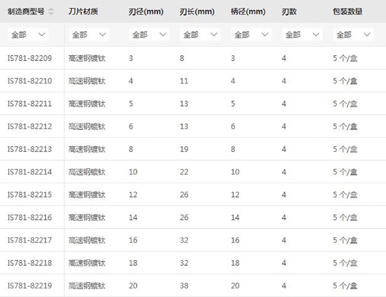 INVOUS 高速钢4刃平头立铣刀,5mm,IS781-82200,5支/盒 |