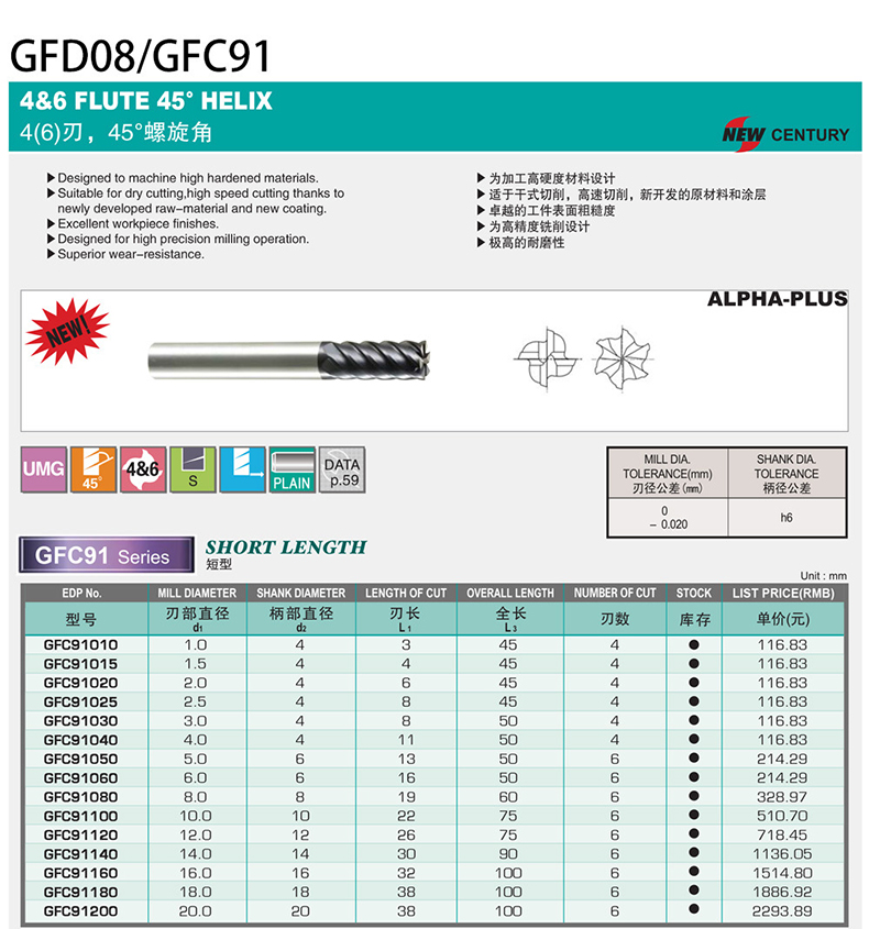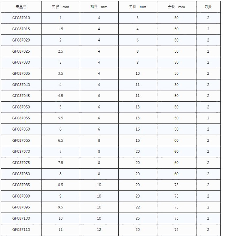 艾逊订货号:C1026014 原始型号:YG 立铣刀,2mm、2刃硬质合金(短型),适于加工高硬度材料 品牌:YG 品牌所属地:韩国