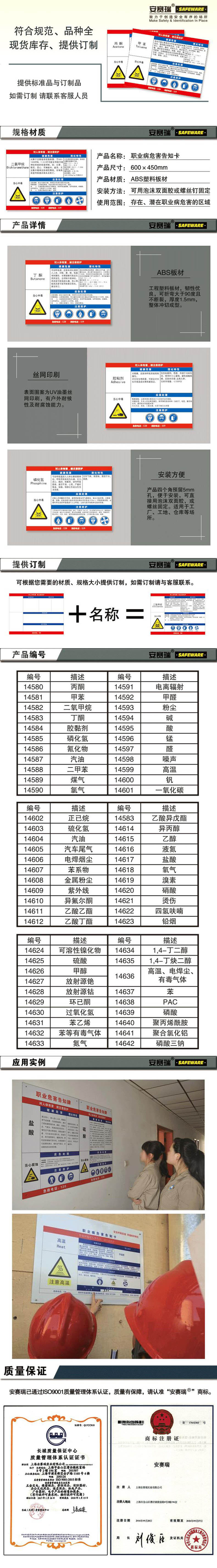 安赛瑞 职业病危害告知卡-苯等有毒气体,ABS板,600×450mm,14632 |